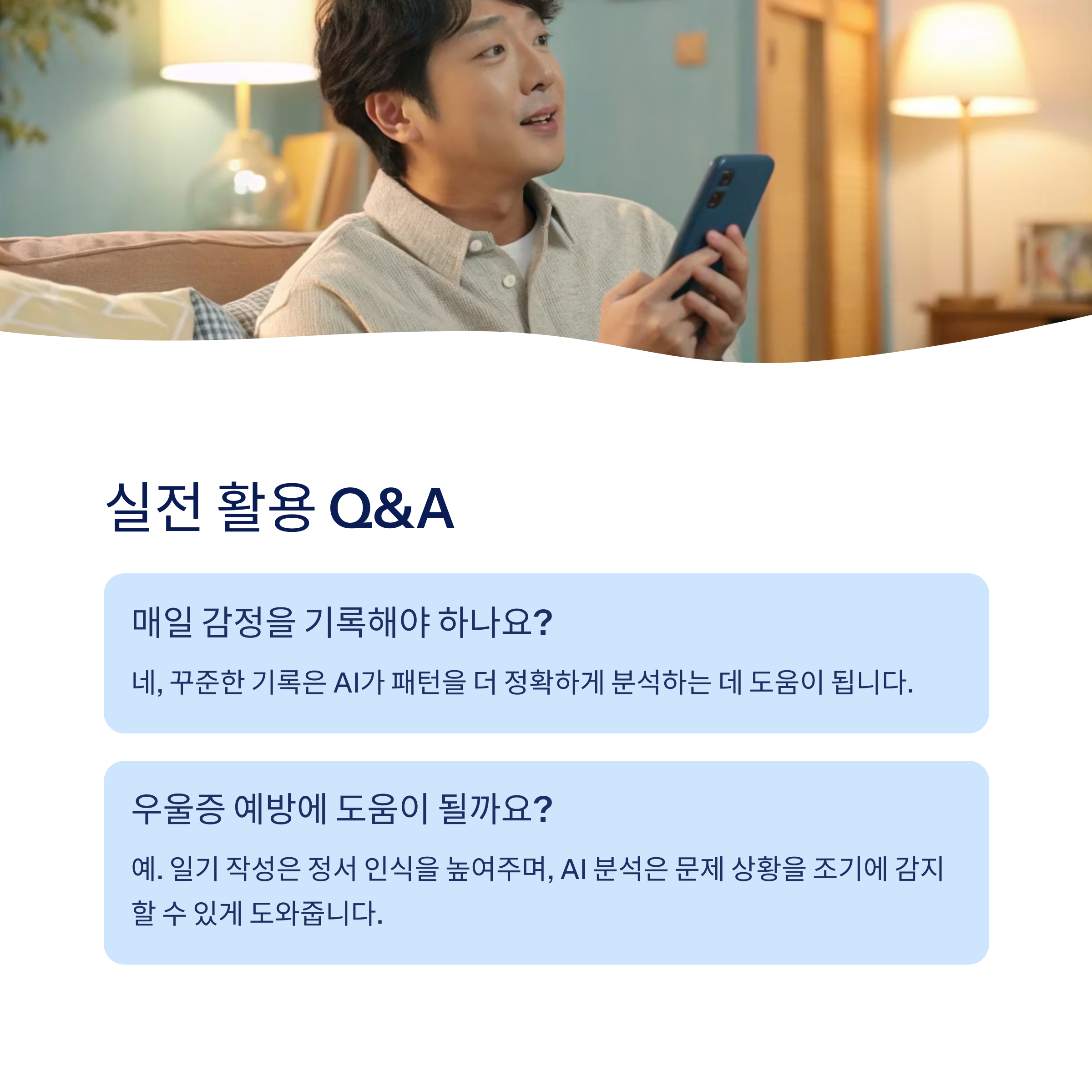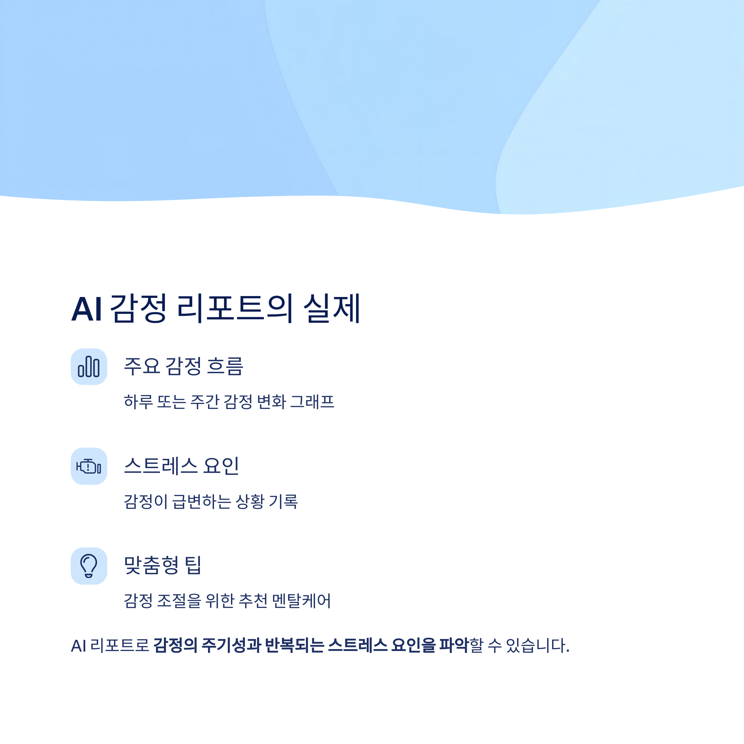특히, AI 리포트를 통해 "감정의 주기성"과 "반복되는 스트레스 요인"을 파악할 수 있다는 점이 핵심입니다.