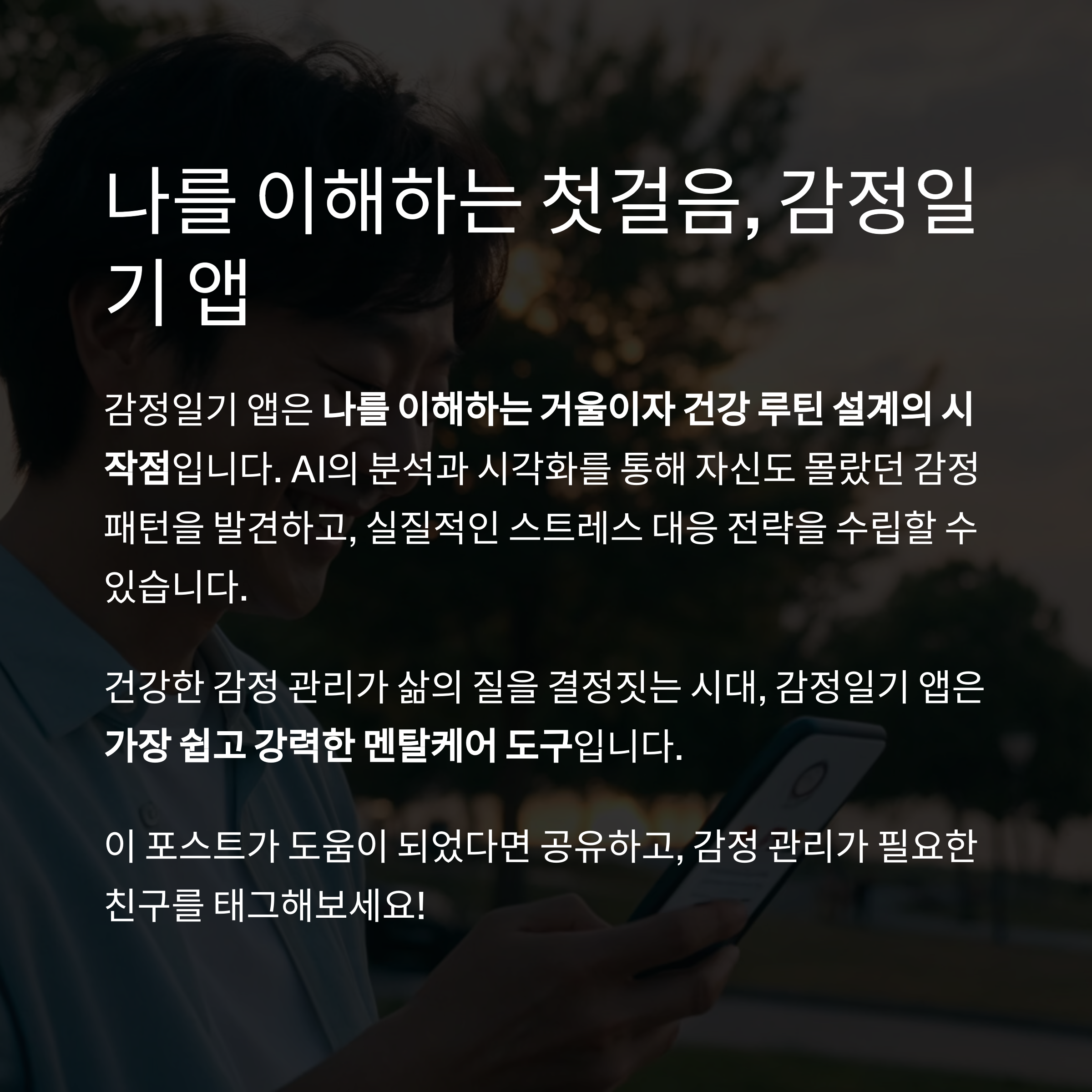 건강한 감정 관리가 삶의 질을 결정짓는 시대, 감정일기 앱은 가장 쉽고 강력한 멘탈케어 도구입니다.