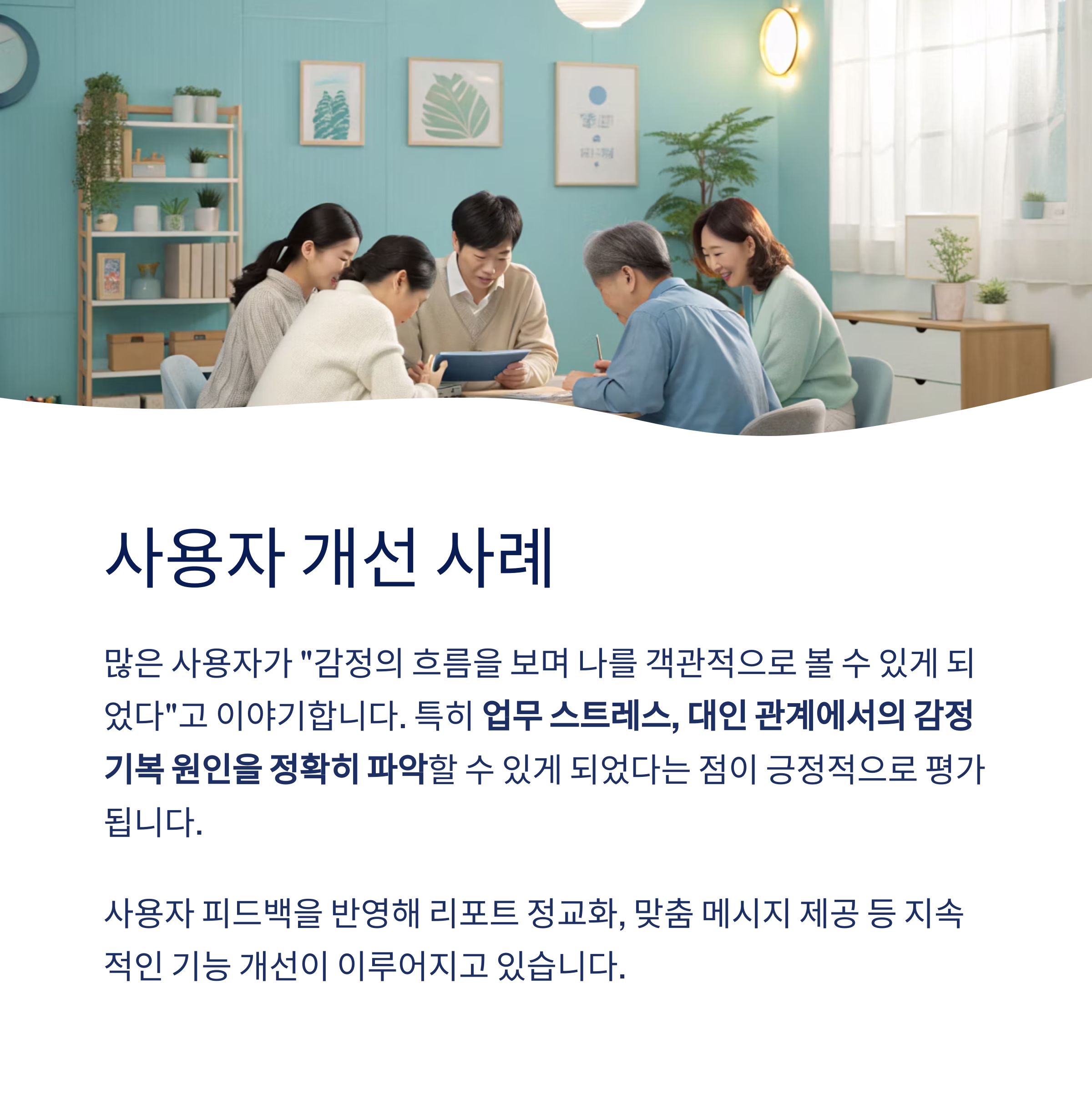 특히 감정 분석 리포트를 통해 업무 스트레스, 대인 관계에서의 감정 기복 원인을 정확히 파악할 수 있게 되었다는 점이 긍정적으로 평가되고 있습니다.