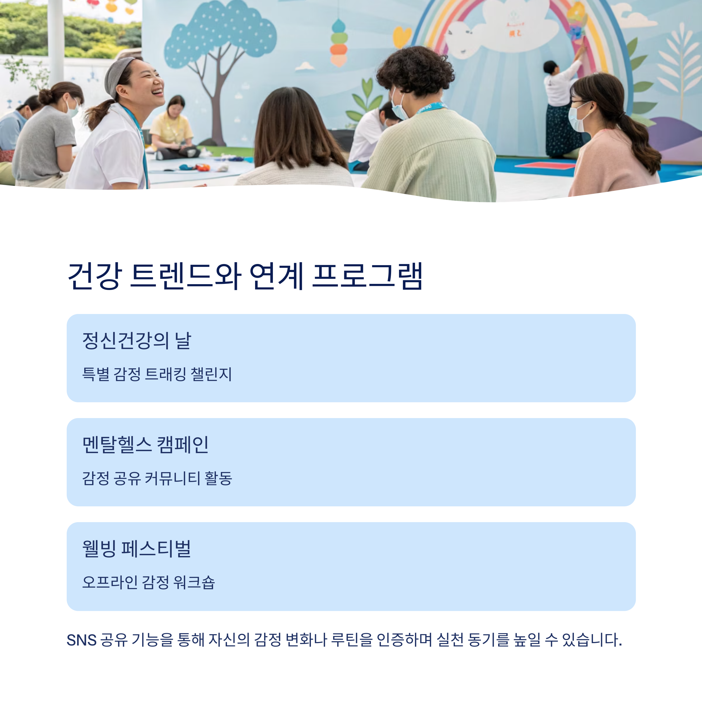 감정일기 앱은 정신건강의 날, 멘탈헬스 캠페인, 웰빙 페스티벌 등 다양한 행사와 연계되어 참여형 건강 콘텐츠도 제공합니다.