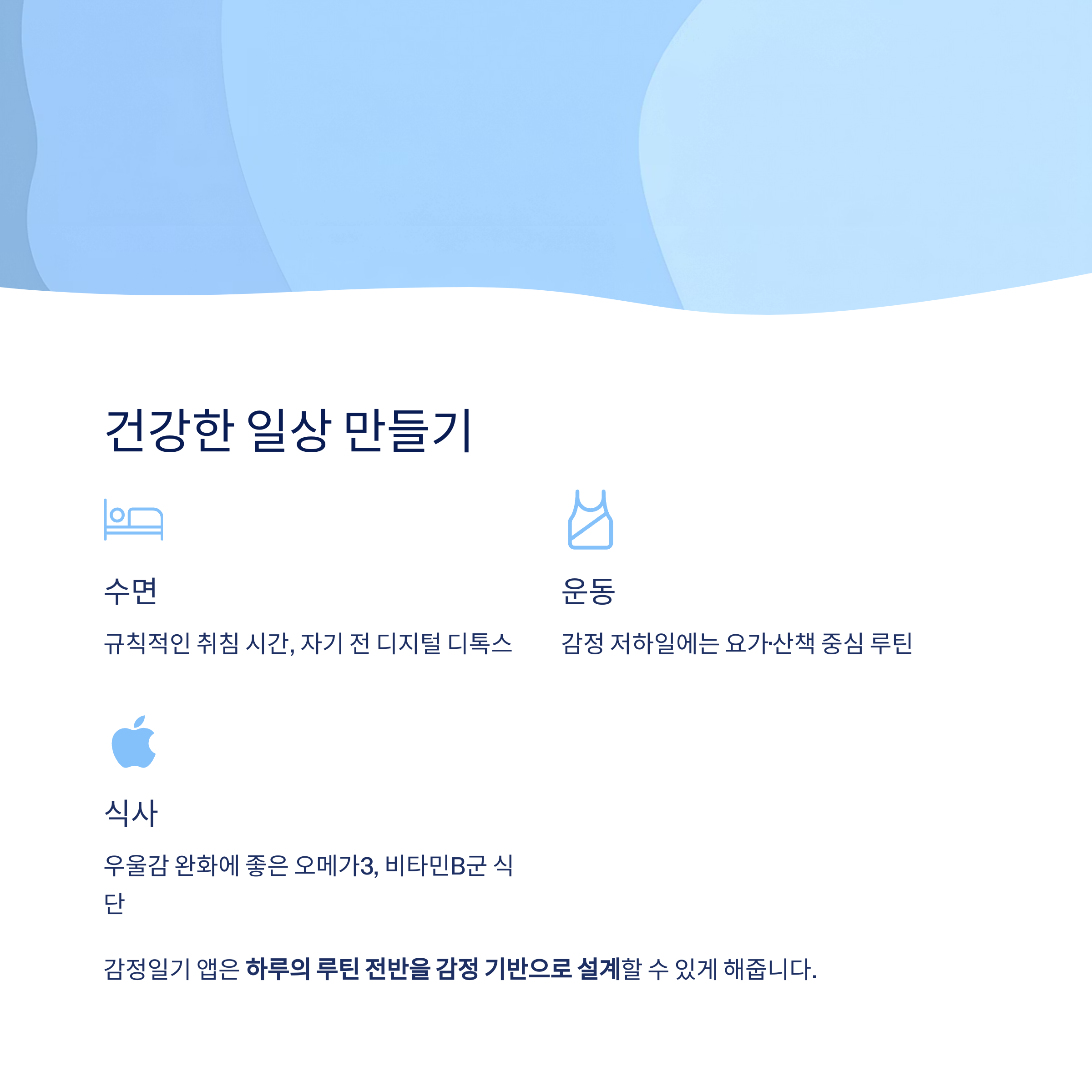 감정일기 앱은 수면, 식단, 운동과의 연동으로 하루의 루틴 전반을 감정 기반으로 설계할 수 있게 해줍니다.