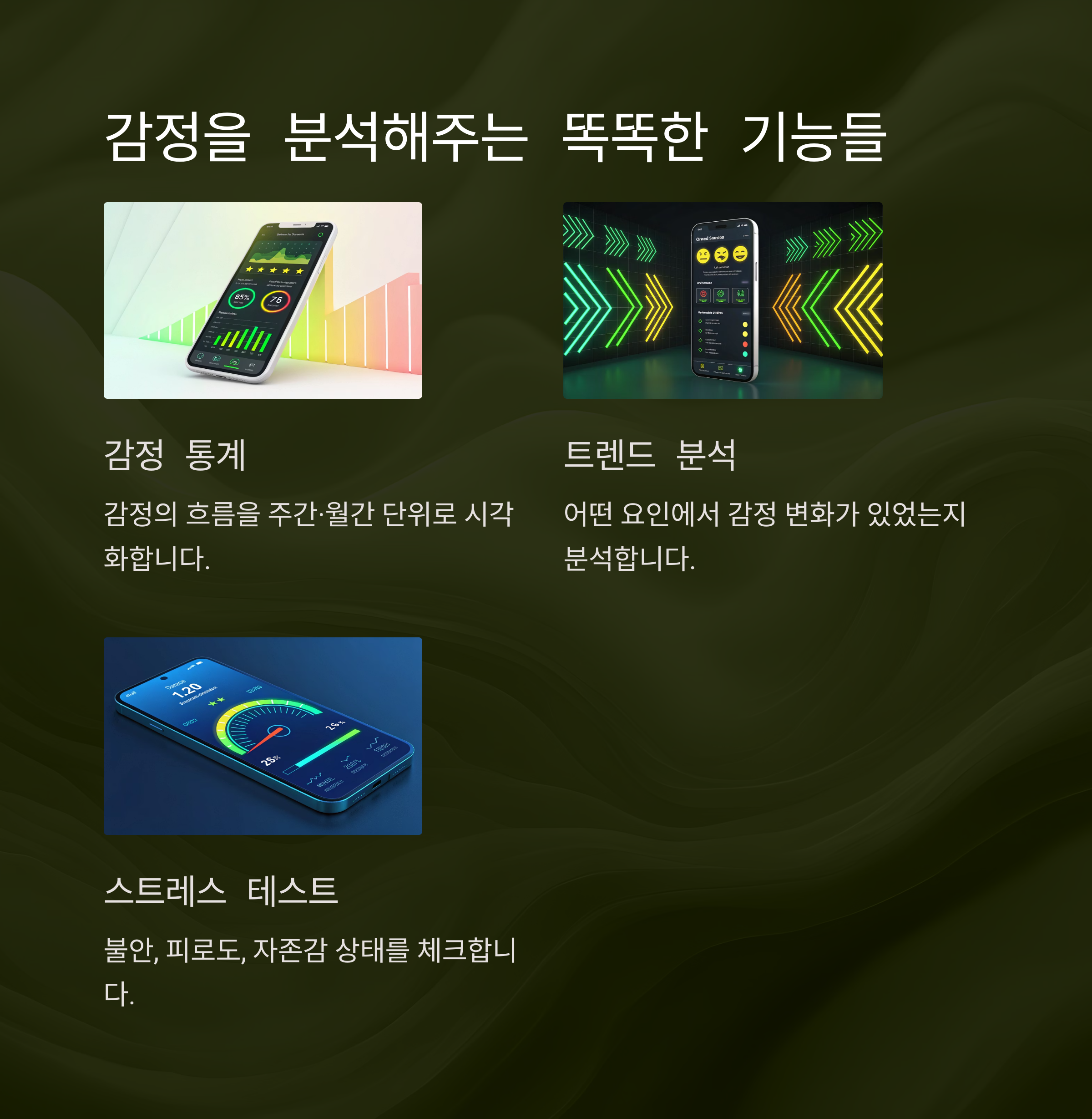 - 스트레스 테스트: 불안, 피로도, 자존감 상태를 체크