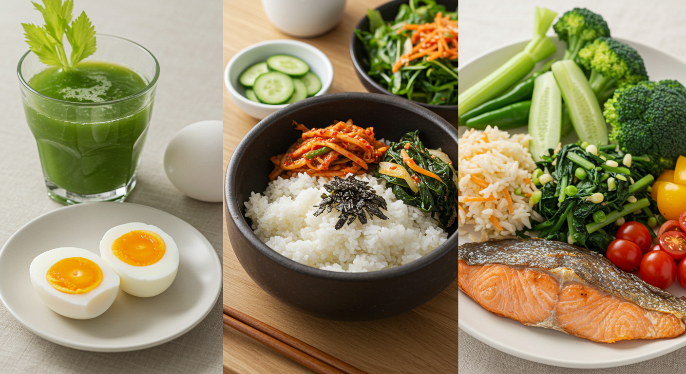 아침 | 삶은 달걀, 견과류, 셀러리 주스 | 공복감 줄이고 에너지 유지 |