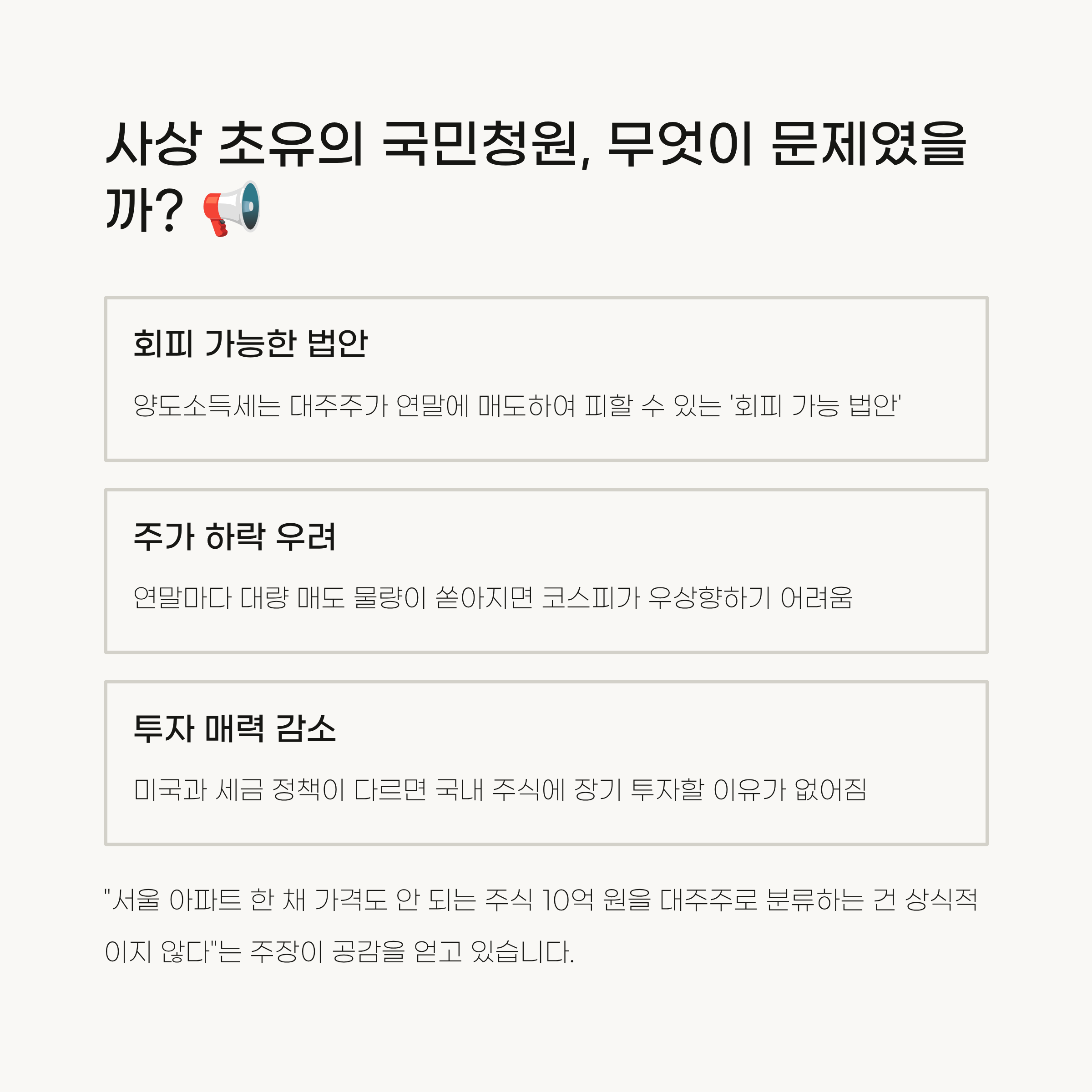 청원자는 "연말 회피용 매물이 쏟아지면 코스피는 '박스피'나 테마성 시장으로 전락할 것"이라고 우려했는데, 저는 이 말이 정말 와닿았어요. 장기적인 기업 성장을 보고 투자하는 건데, 세금 때문에 연말마다 팔고 다시 사야 한다면 누가 장기 투자를 하겠어요? 미국 시장처럼 비과세 환경에서 자금이 흘러나가게 될까 봐 걱정하는 분들도 많더라고요.