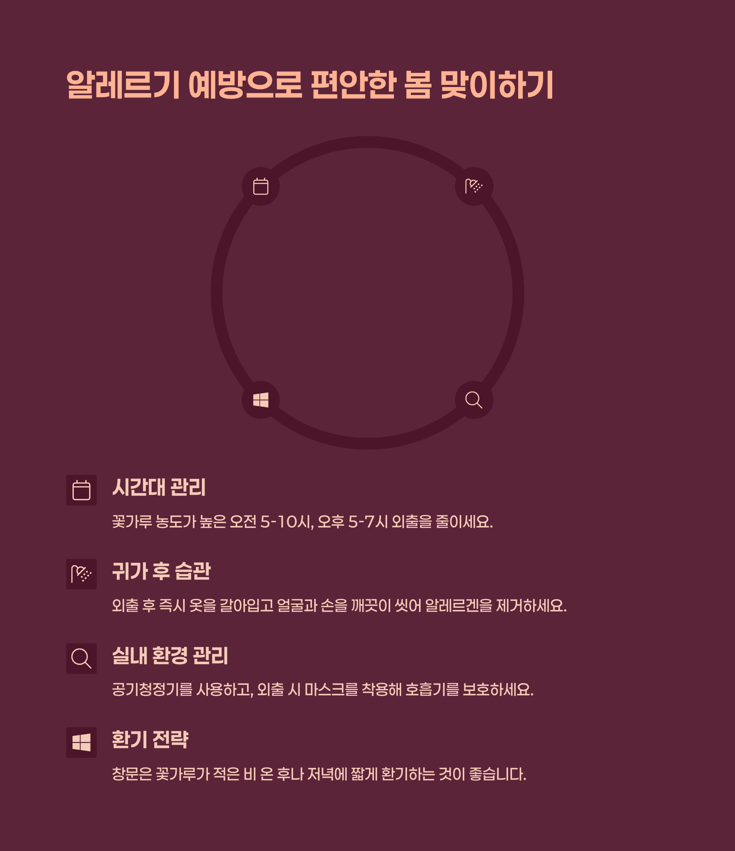 봄은 꽃가루와 미세먼지로 알레르기 증상이 심해지는 계절입니다. 미리 대비하면 증상을 크게 줄일 수 있어요.