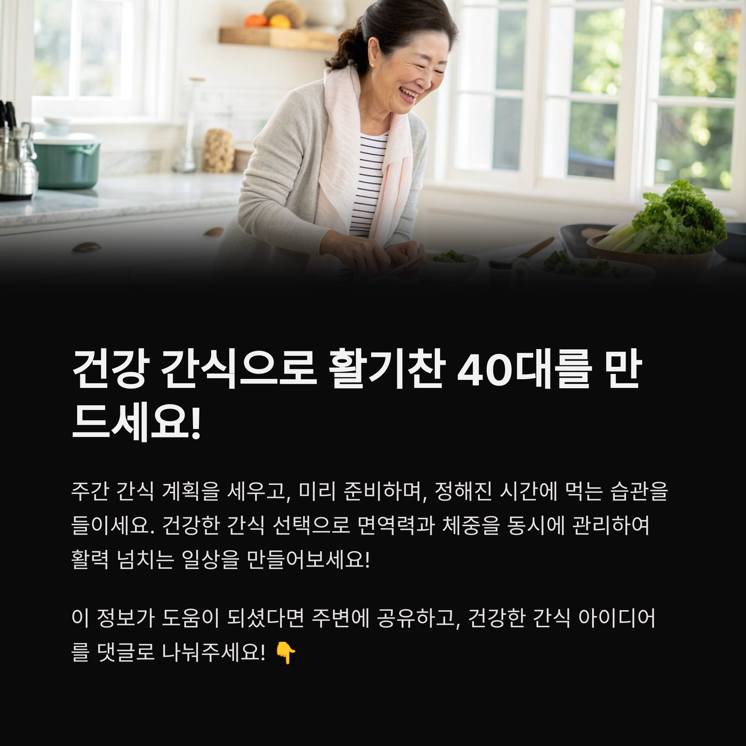 건강한 간식은 단순한 허기 해결을 넘어, 체중 관리와 면역력 강화라는 두 가지 목표를 동시에 이룰 수 있는 중요한 식습관입니다. 특히 40대 이후라면 더 신중한 선택이 필요하겠죠?
