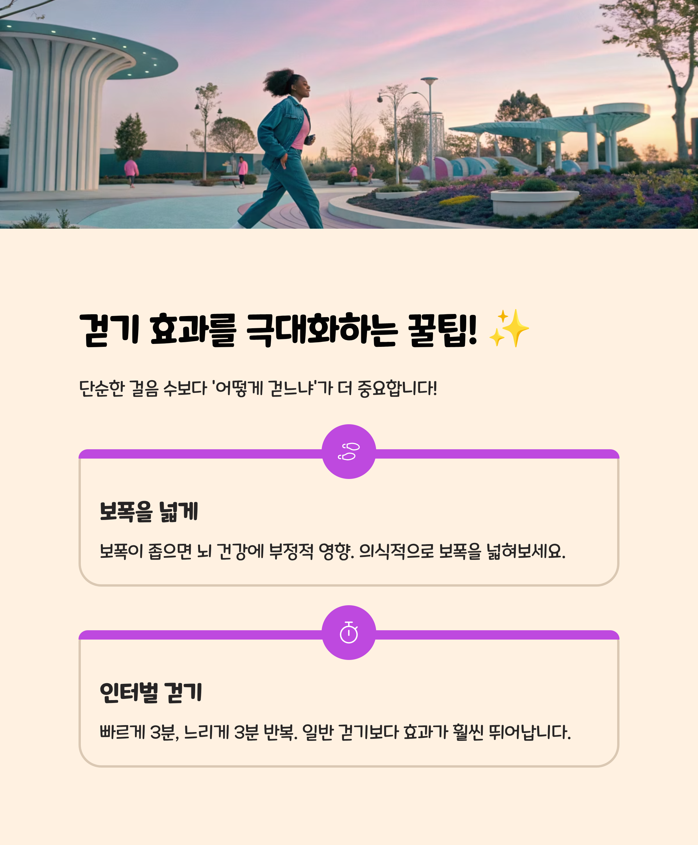- 보폭을 넓게: 보폭을 좁게 걷는 습관은 뇌 건강에 부정적인 영향을 줄 수 있어요. 의식적으로 보폭을 넓혀 걸어보세요.
