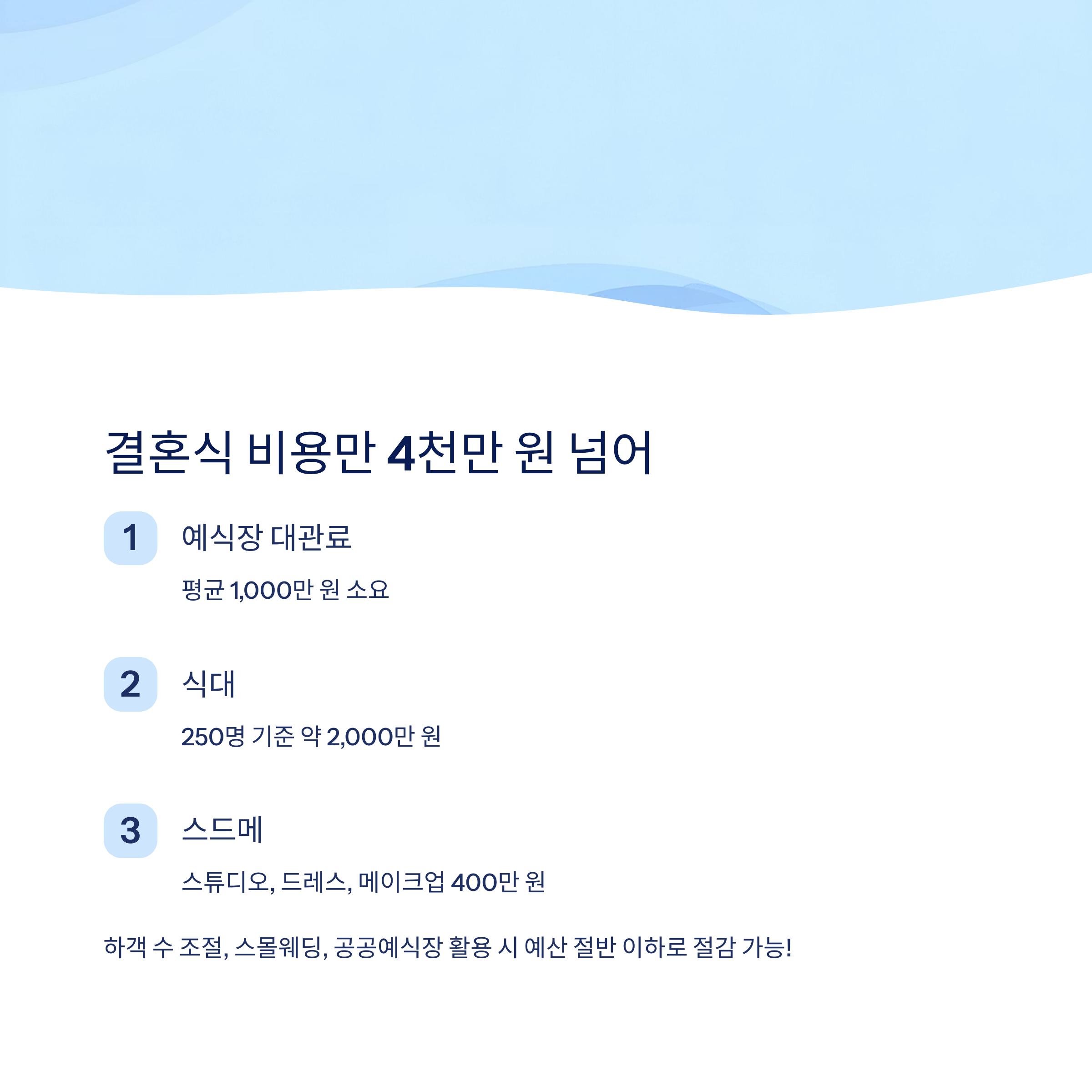 다만, 하객 수 조절이나 스몰웨딩, 공공예식장을 활용하면