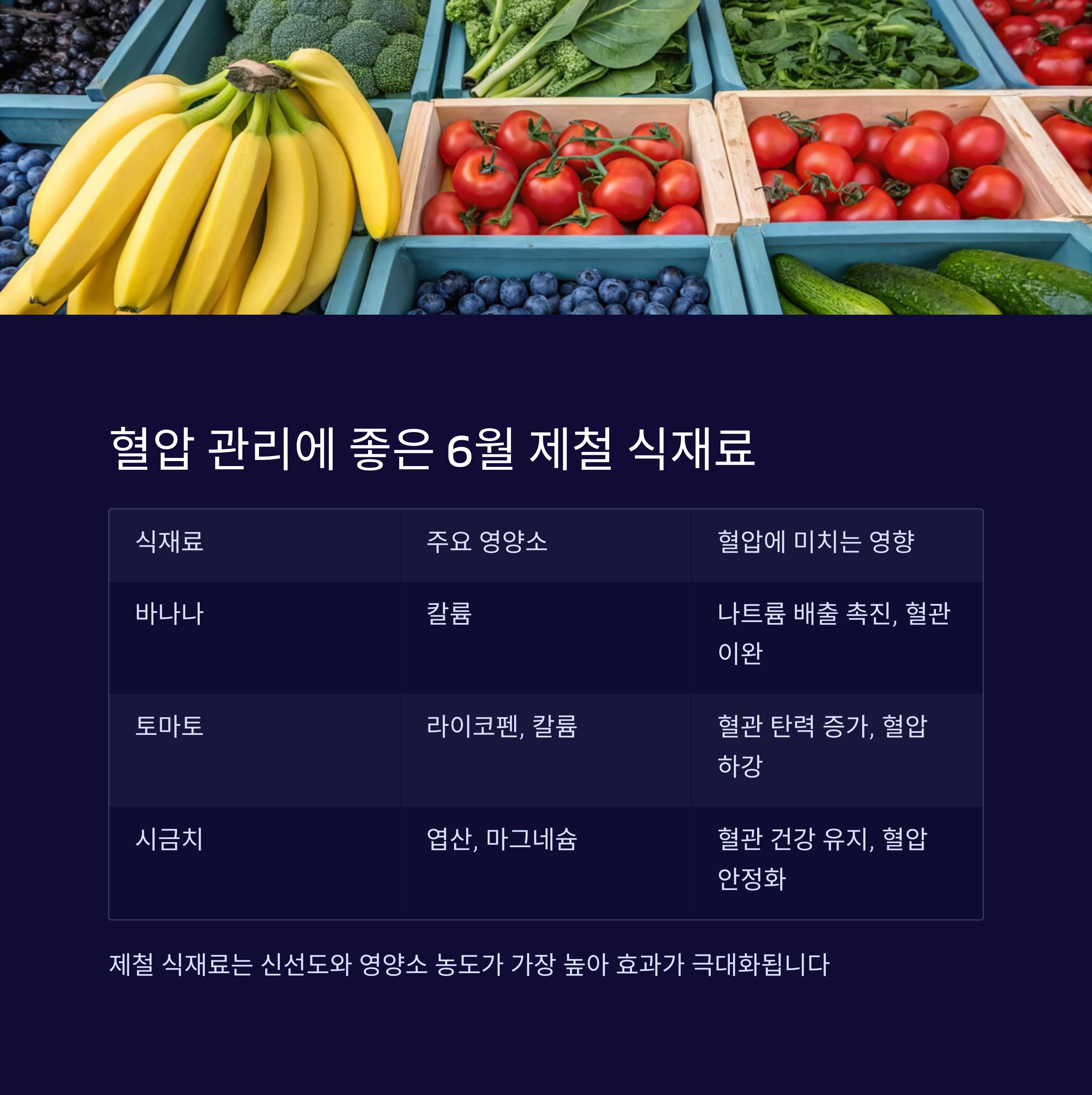 6월은 신선한 채소와 과일이 풍부한 계절로, 혈압을 안정시키기에 최적의 시기입니다.