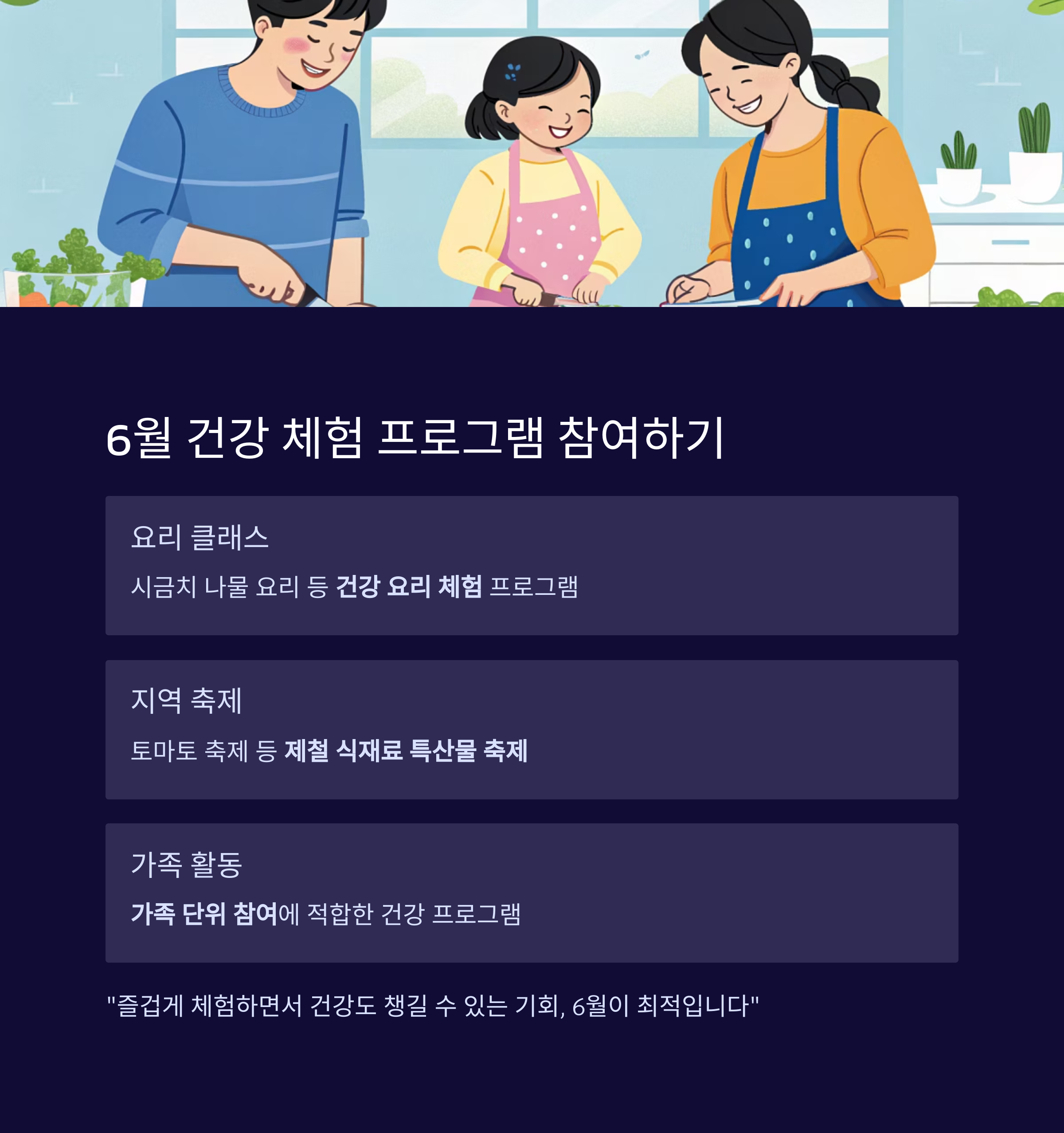 6월은 전국 곳곳에서 건강 요리 체험, 지역 특산물 축제가 열립니다.