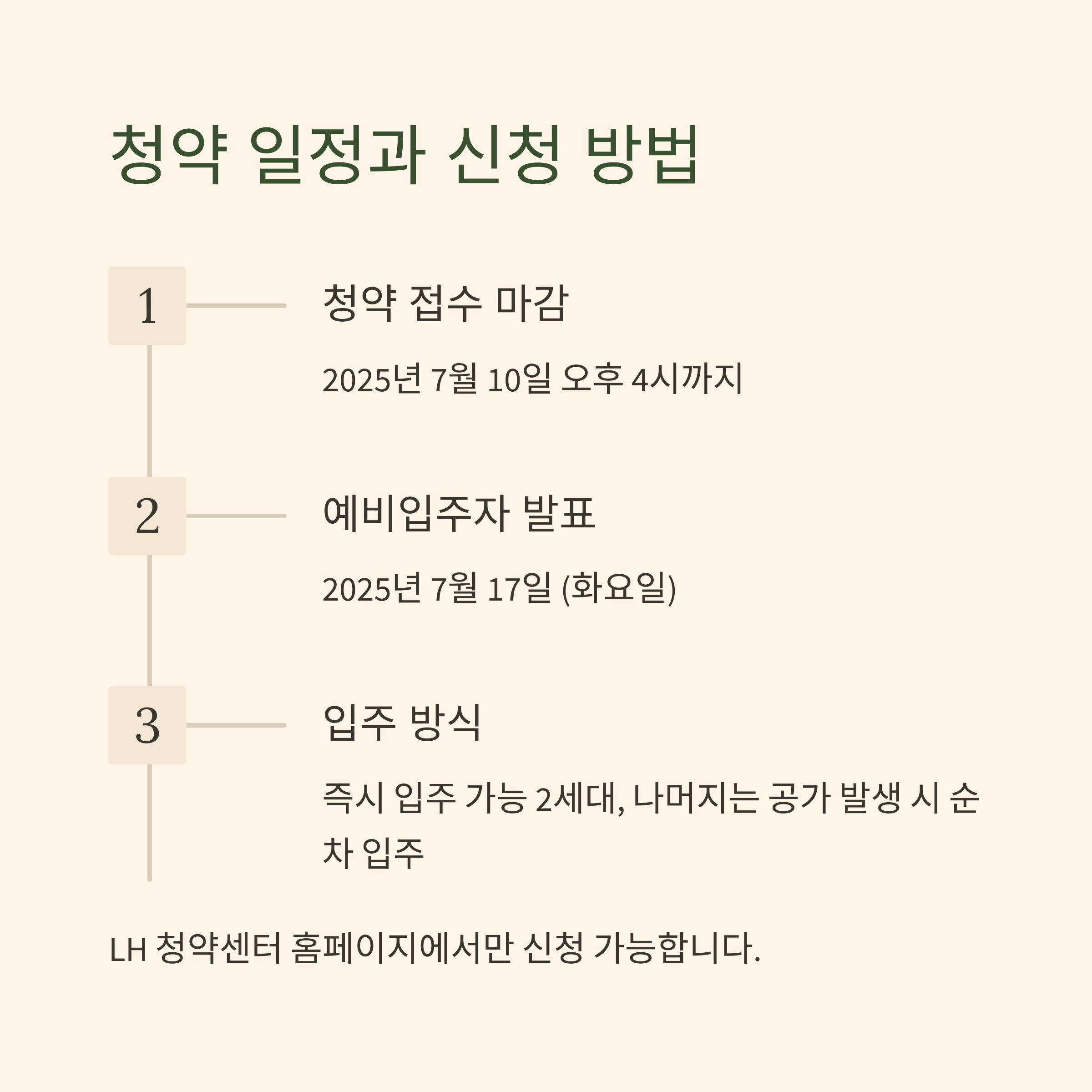 청약은 2025년 7월 10일 오후 4시까지 LH 청약센터 홈페이지에서만 가능합니다.