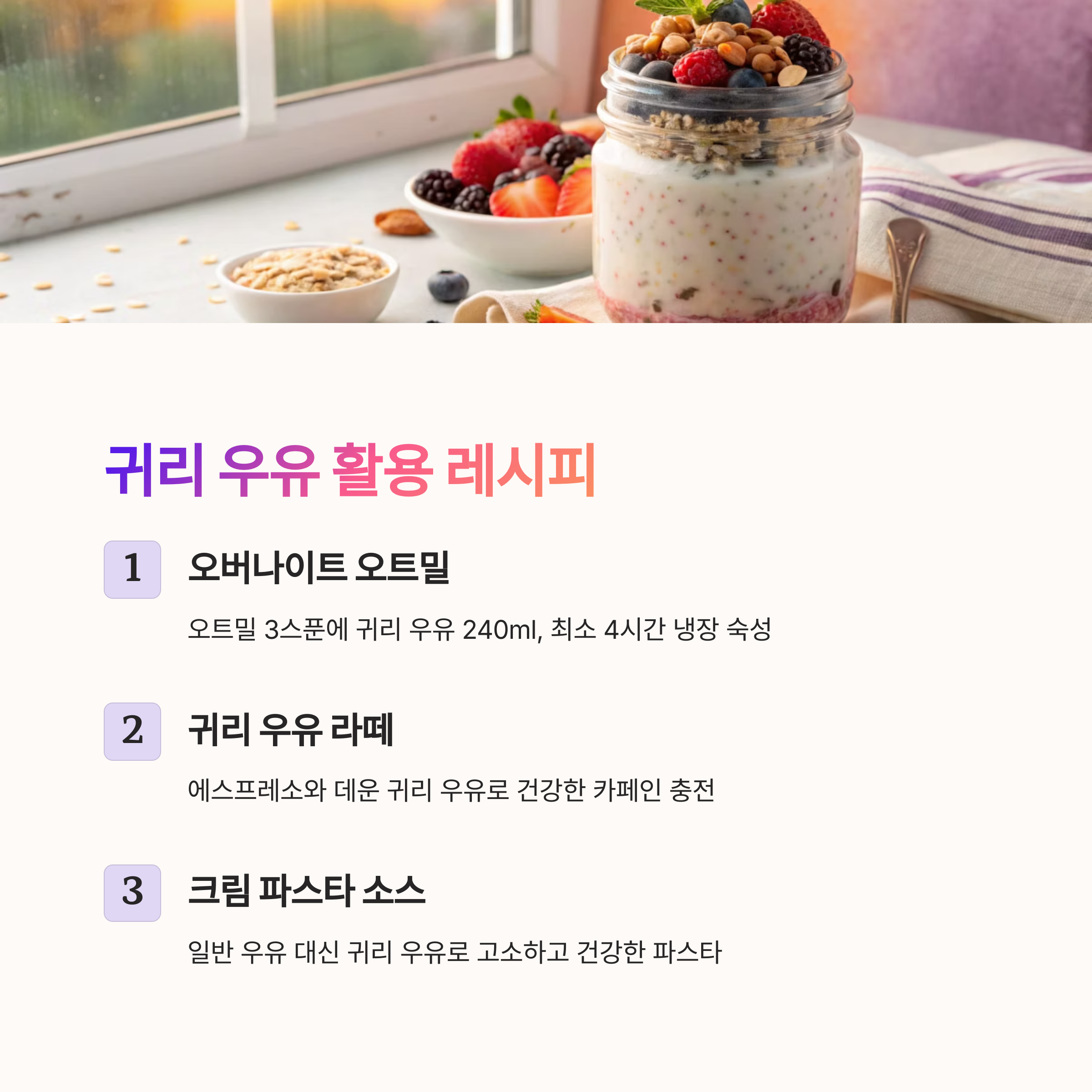 - 요리할 때 일반 우유 대신 귀리 우유를 써보세요