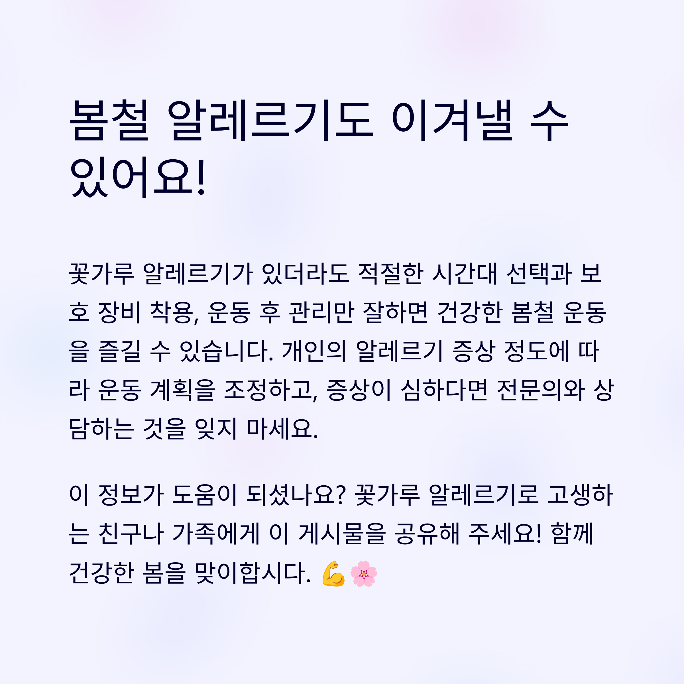 여러분은 어떤 방법으로 봄철 알레르기를 이겨내며 운동하고 계신가요? 댓글로 여러분만의 팁이나 경험을 공유해주세요. 다른 독자들에게도 큰 도움이 될 것입니다. 그리고 이 글이 도움이 되셨다면 주변의 알레르기로 고생하는 친구들에게도 공유해주세요!