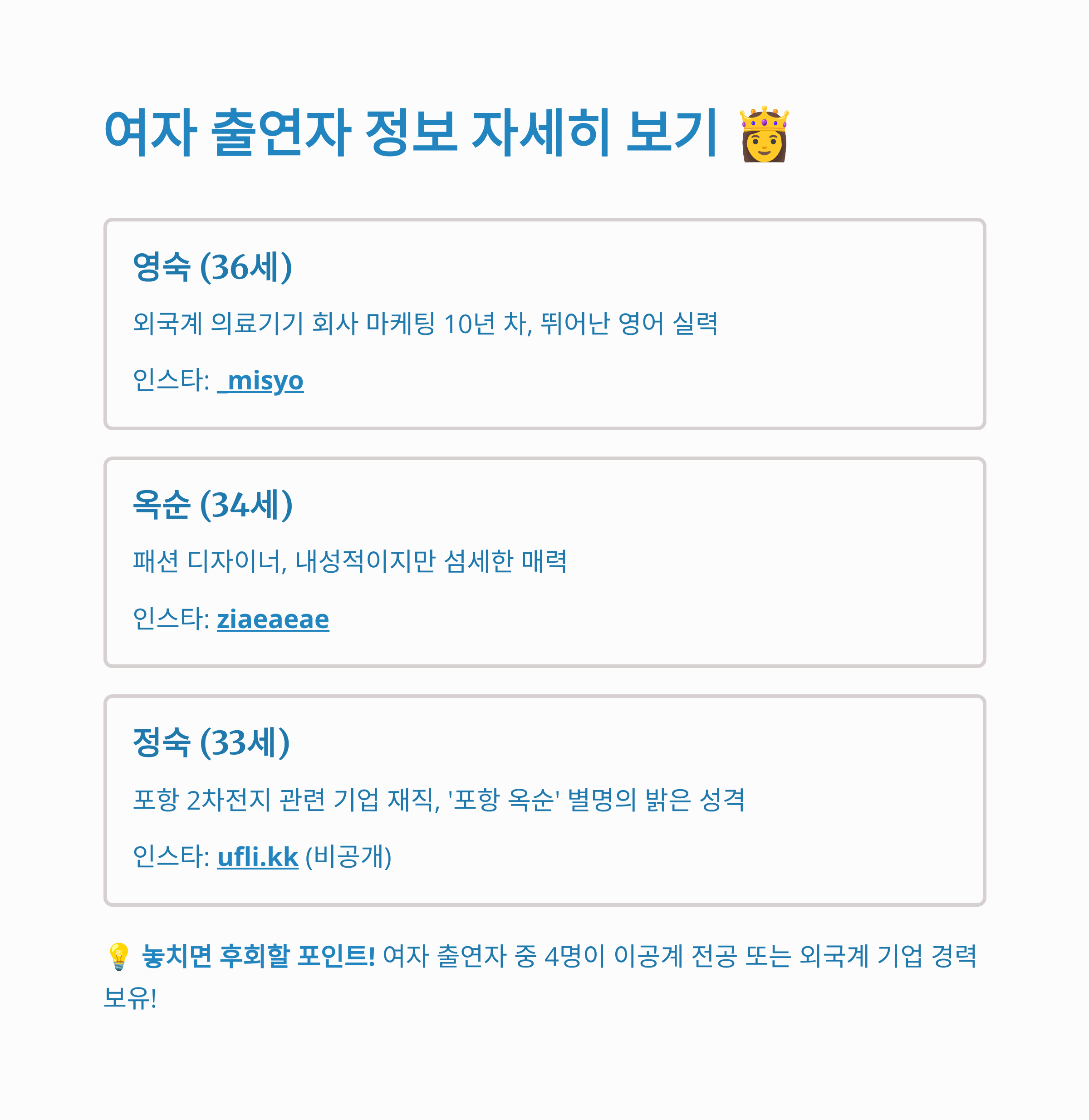 여자 출연자 중 무려 4분이 이공계 전공 또는 외국계 기업 경력을 갖춘 '능력녀'라는 사실! 지성과 미모를 겸비한 분들이라 더 응원하게 되는 것 같아요. 특히 정숙님은 포항의 '에코프로머티리얼즈'와 같은 2차전지 관련 기업에 재직 중인 것으로 추정되어 더욱 화제가 되고 있죠.