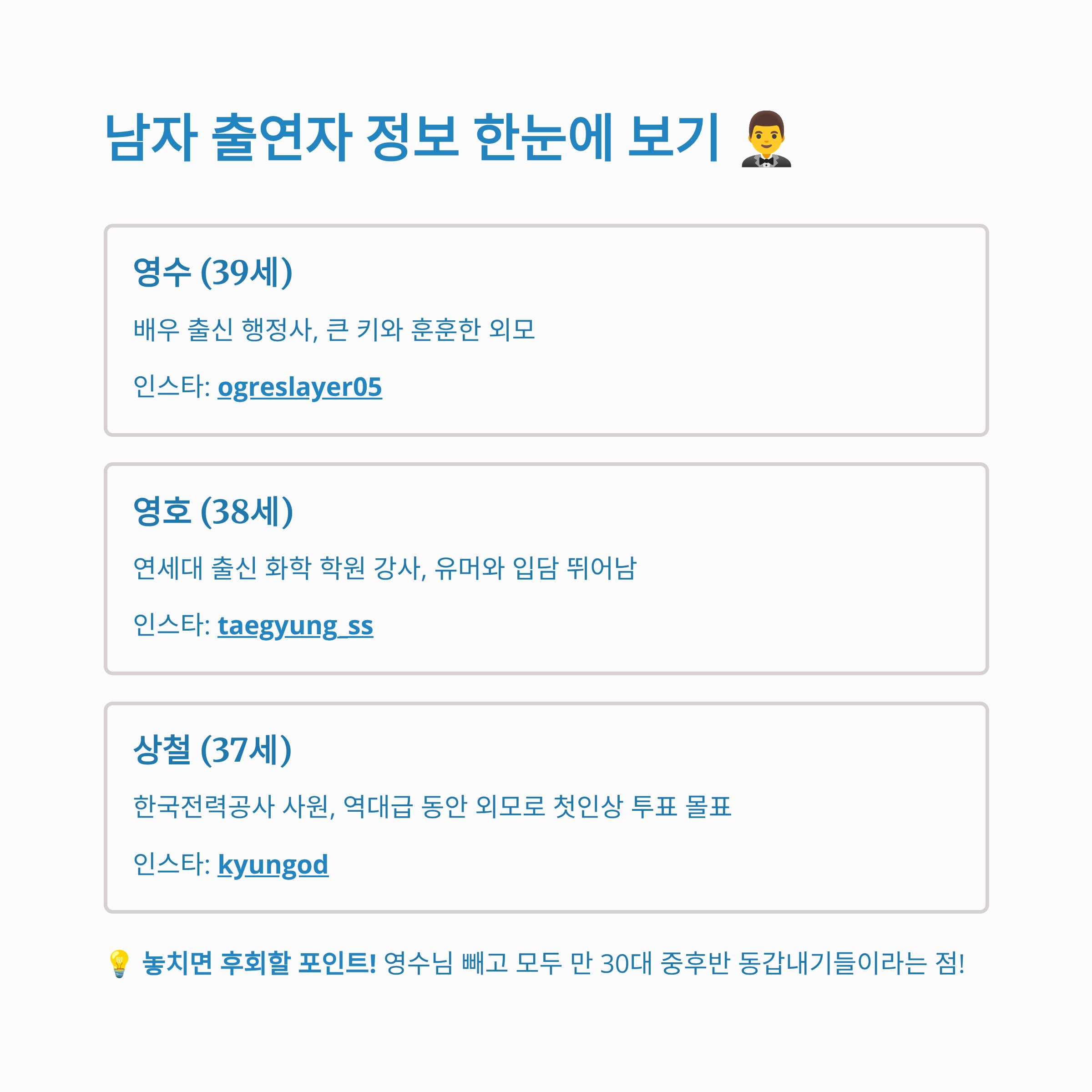 - 영철: 1990년생 (만 35세), IT 컨설턴트 및 프로젝트 매니저. 깔끔하고 듬직한 인상이 시선을 사로잡죠. 인스타그램은 eon90_hello.