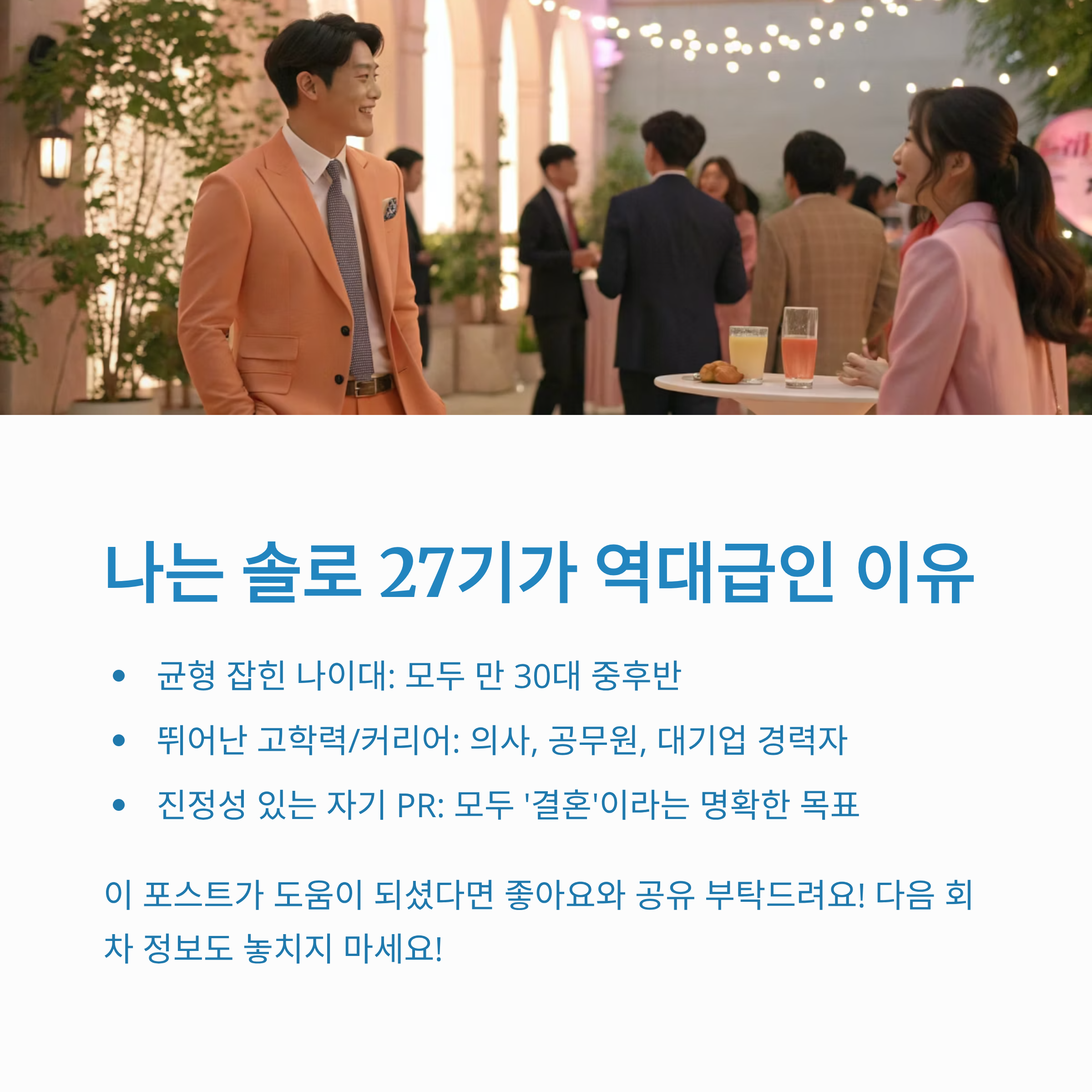 이번 '나는 솔로 27기'는 외모와 지성, 전문성을 모두 갖춘 출연진들 덕분에 정말 흥미진진한 전개가 예상됩니다. 앞으로 어떤 로맨스가 펼쳐질지, 누가 최종 커플이 될지 함께 지켜보자고요! 😊