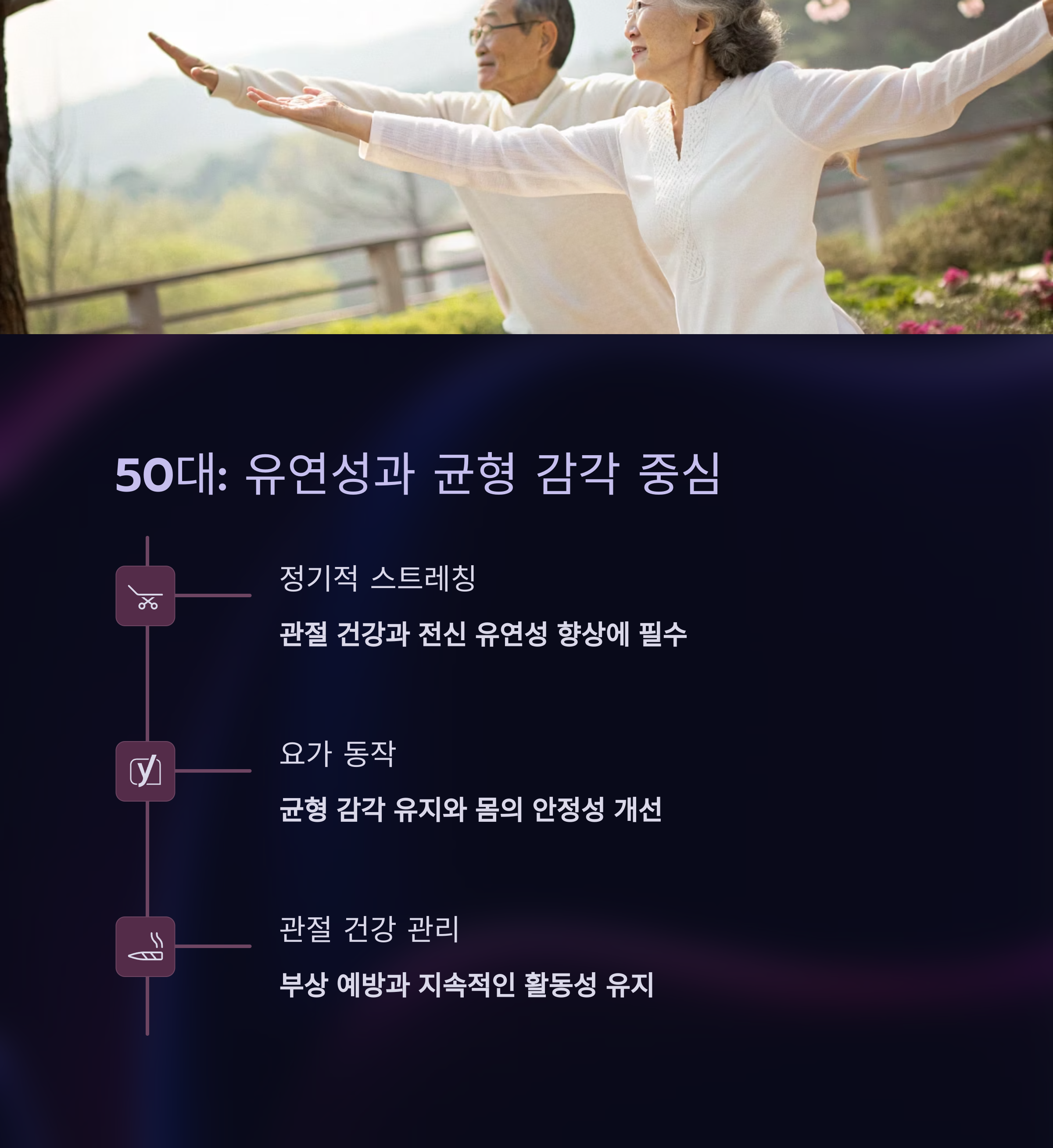 🧘 50대: 유연성과 균형 감각을 키우는 시기