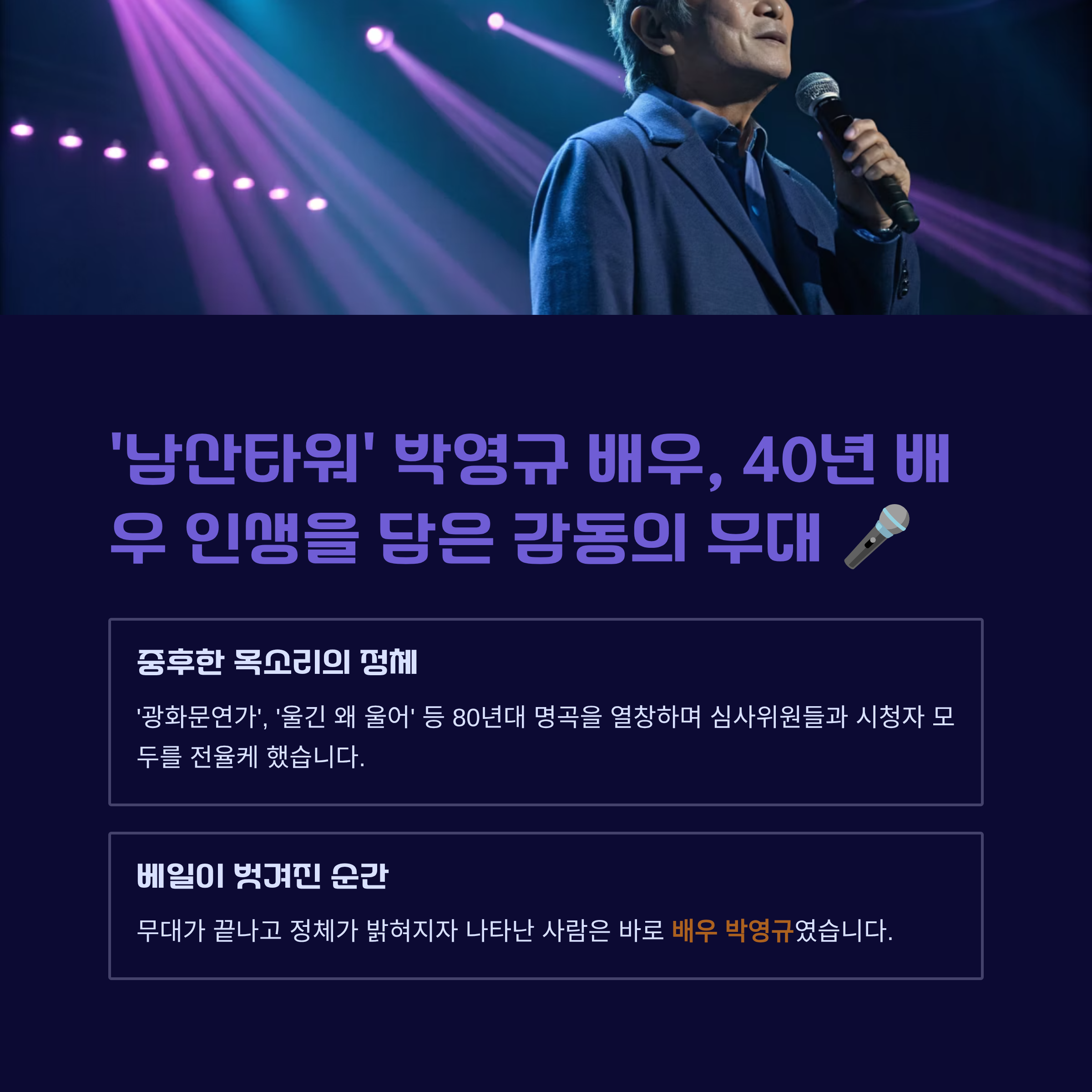 무대가 끝나고 모두가 그의 정체를 궁금해하는 순간, 베일이 벗겨지자 나타난 사람은 바로 배우 박영규였습니다. 무려 40년 차 베테랑 배우의 등장에 멤버들은 물론 시청자들도 충격과 감동에 휩싸였죠.