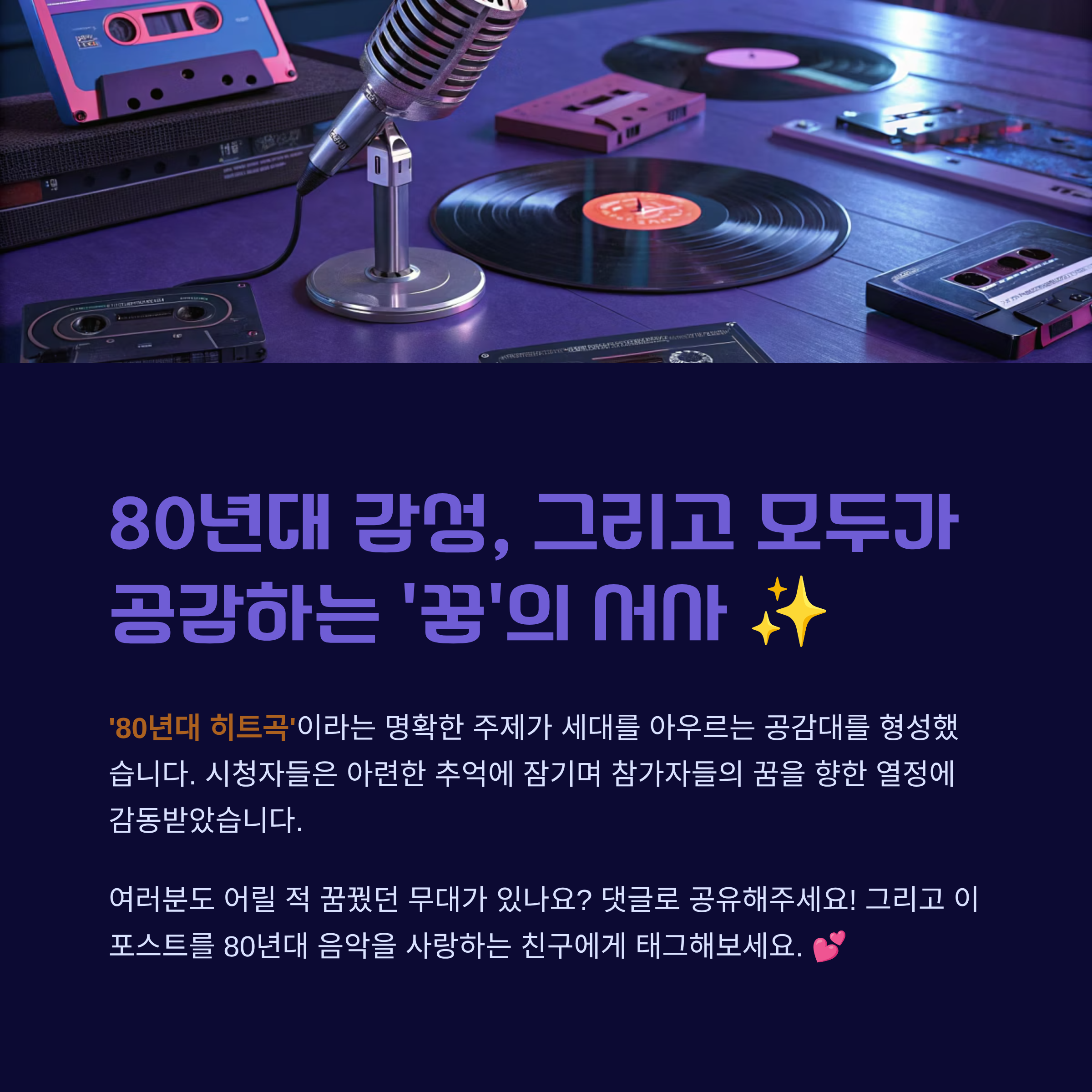 - 시대를 관통하는 명곡: 80년대 히트곡이라는 명확한 컨셉으로 세대별 시청자층 모두를 아우름.