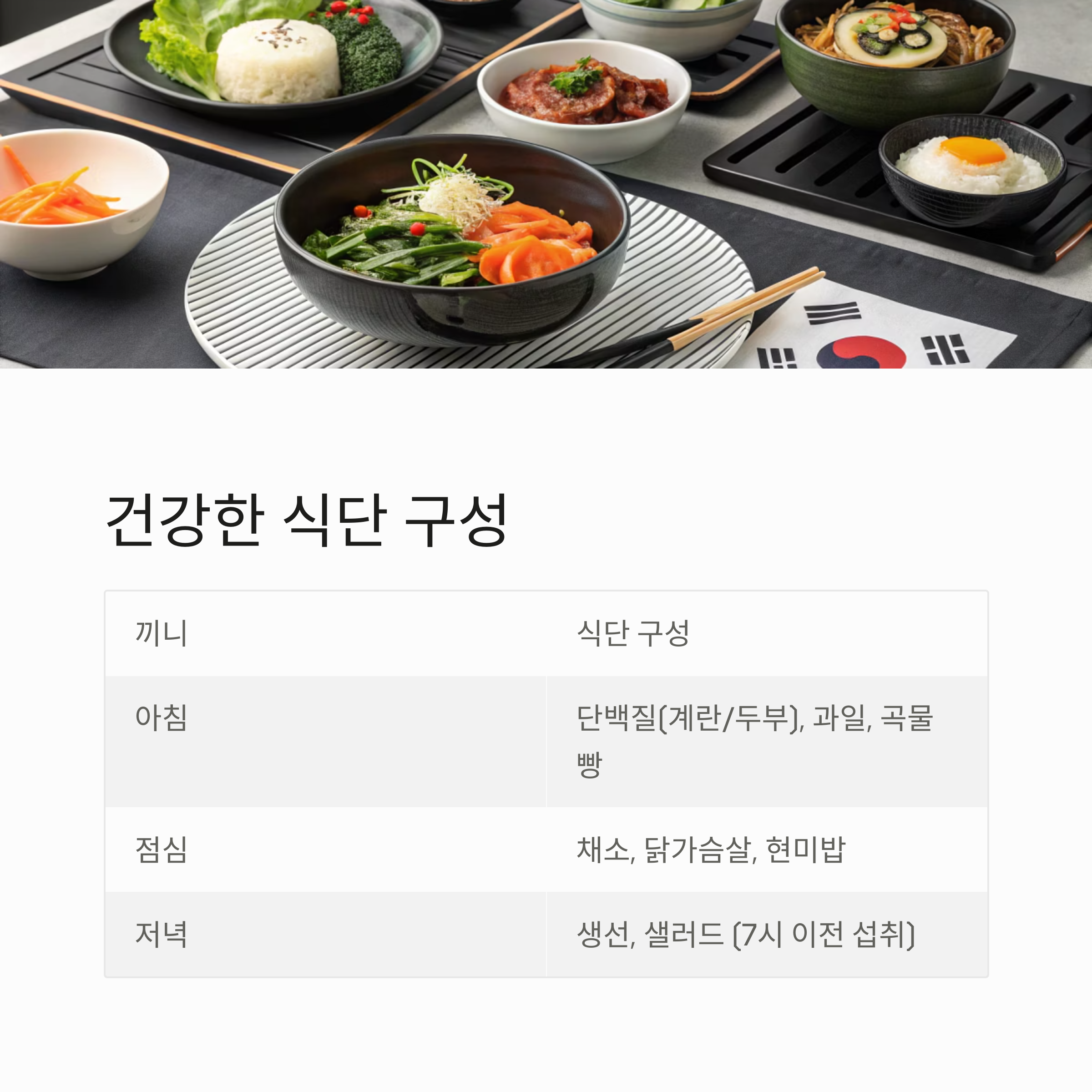 | 아침 | 단백질(계란/두부), 과일, 곡물빵 |