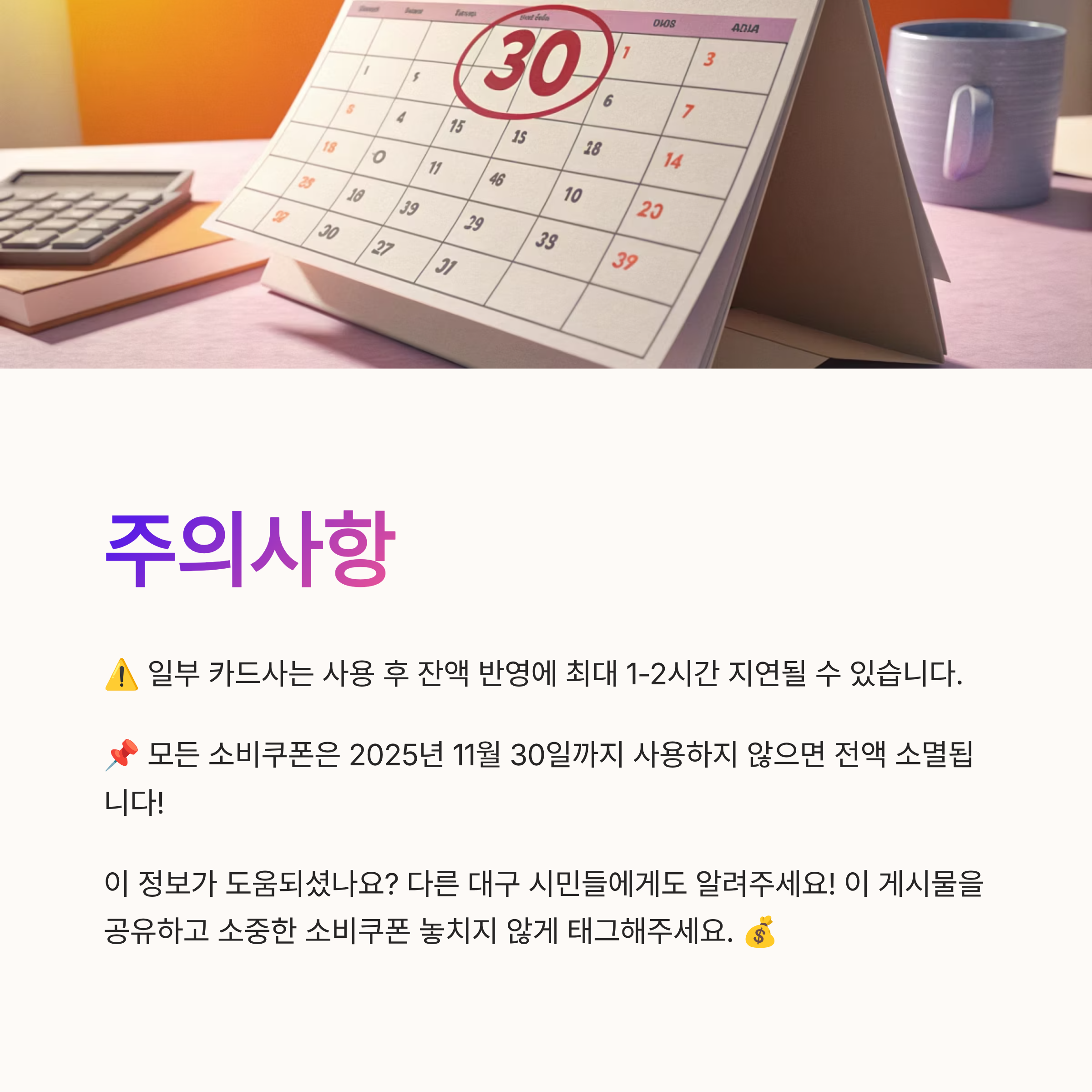 가장 중요한 포인트! 모든 소비쿠폰은 2025년 11월 30일까지 사용하지 않으면 잔액이 전부 소멸됩니다. 한 번 소멸된 금액은 절대 복구되지 않으니, 이 날짜를 꼭 기억하고 미리미리 사용하세요.