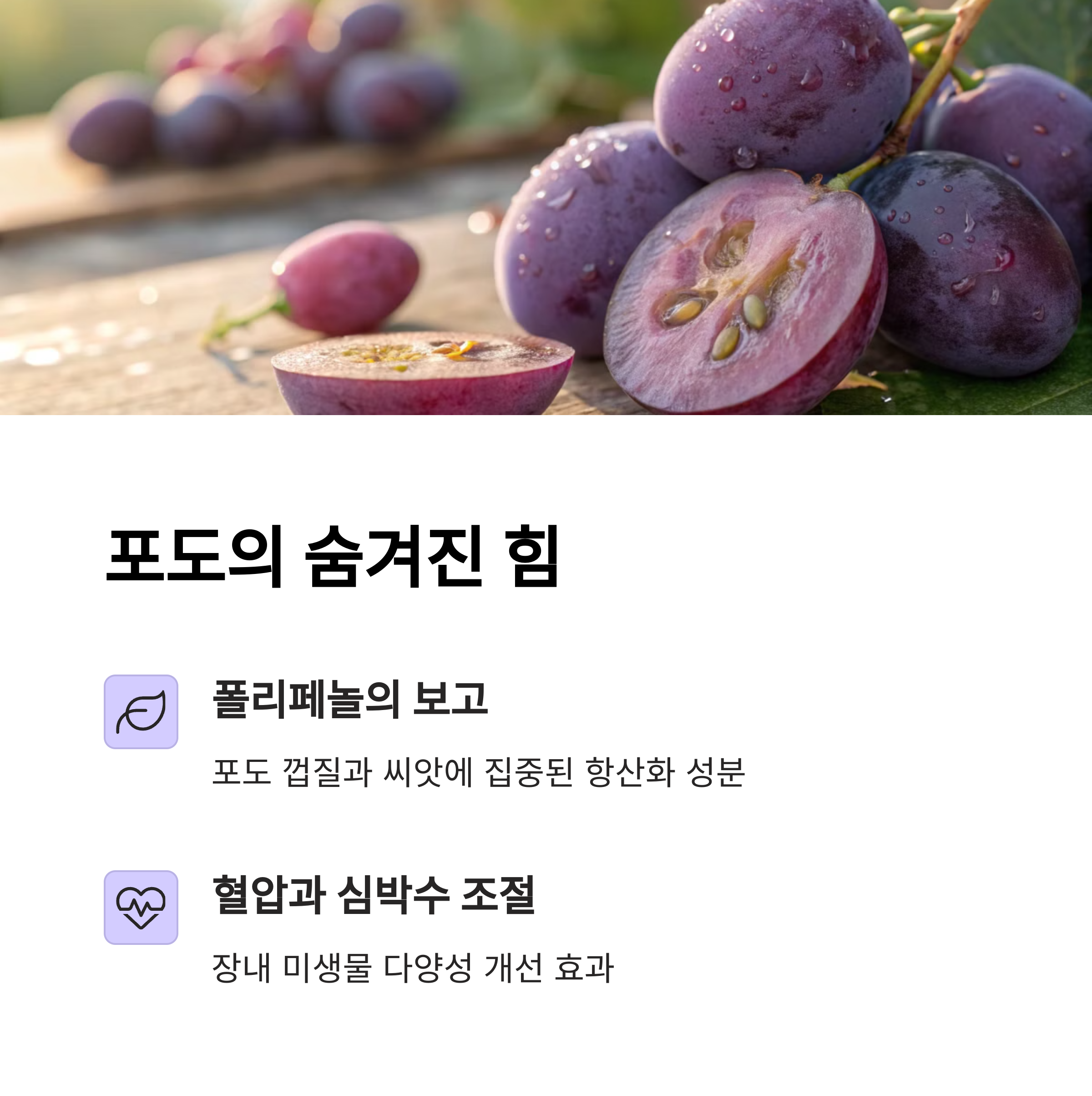 포도는 그 자체로도 대사증후군 예방에 효과적인 과일입니다. 특히, 포도의 껍질과 씨앗에 포함된 폴리페놀 성분은 혈압을 낮추고 심박수를 조절하는 데 도움을 줍니다. 또한, 포도의 폴리페놀은 심혈관 질환 예방에도 중요한 역할을 하며, 체내 염증을 줄이는 효과도 있습니다. 포도의 건강에 좋은 성분은 우리의 혈관을 보호하고, 대사증후군의 발생을 예방하는 데 기여합니다.