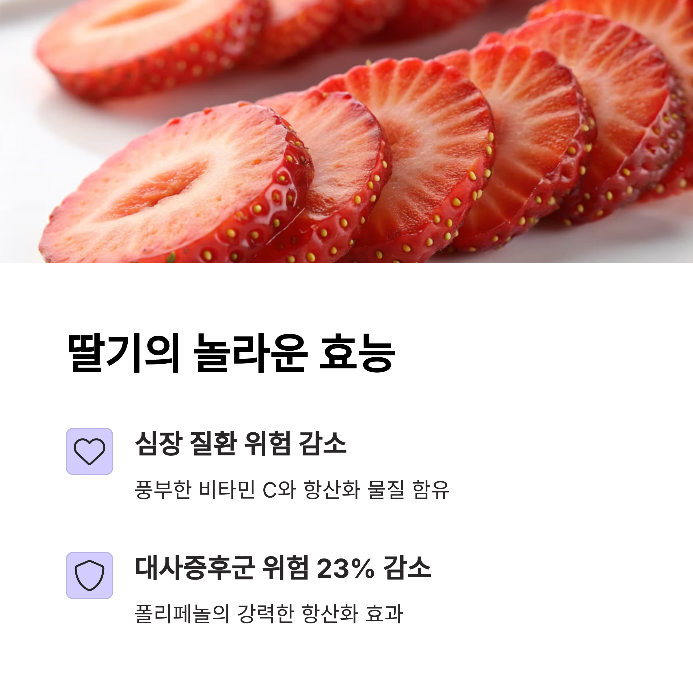| 딸기 | 심장 질환 예방에 효과적인 항산화 물질이 풍부 |