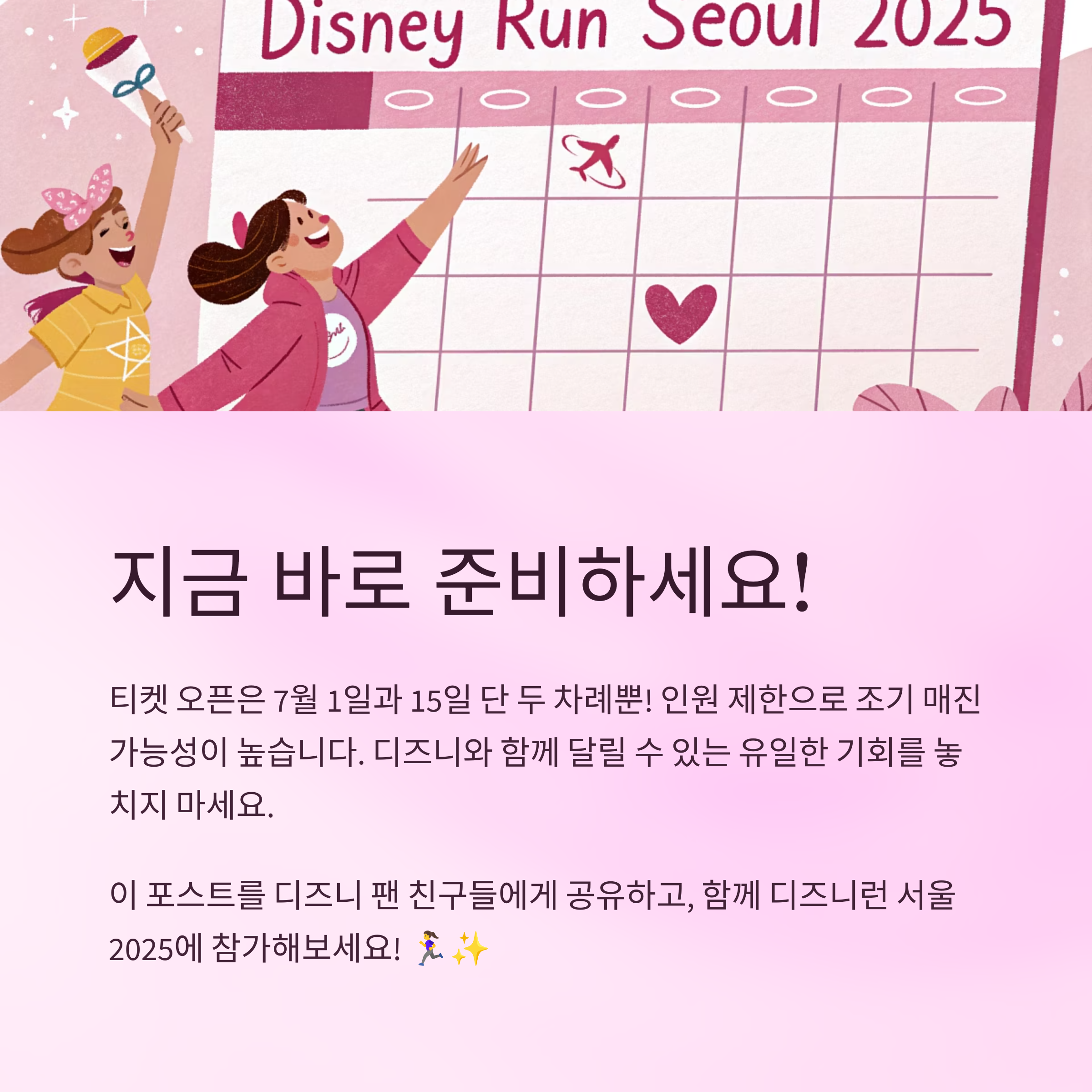 2025년 10월, 서울 여의도공원이 디즈니의 마법으로 물듭니다. ‘디즈니런 서울 2025’는 단순한 달리기 행사가 아니라, 디즈니 팬들과 러너들이 함께 즐기는 대형 페스티벌입니다. 미키 마우스, 겨울왕국, 인어공주 등 인기 캐릭터들과 달릴 수 있는 이 특별한 행사는 예매가 필수이며, 치열한 경쟁이 예상됩니다. 본 글에서는 예매 일정, 코스, 참가비, 이벤트, 준비 전략까지 핵심만 콕 집어 알려드립니다.