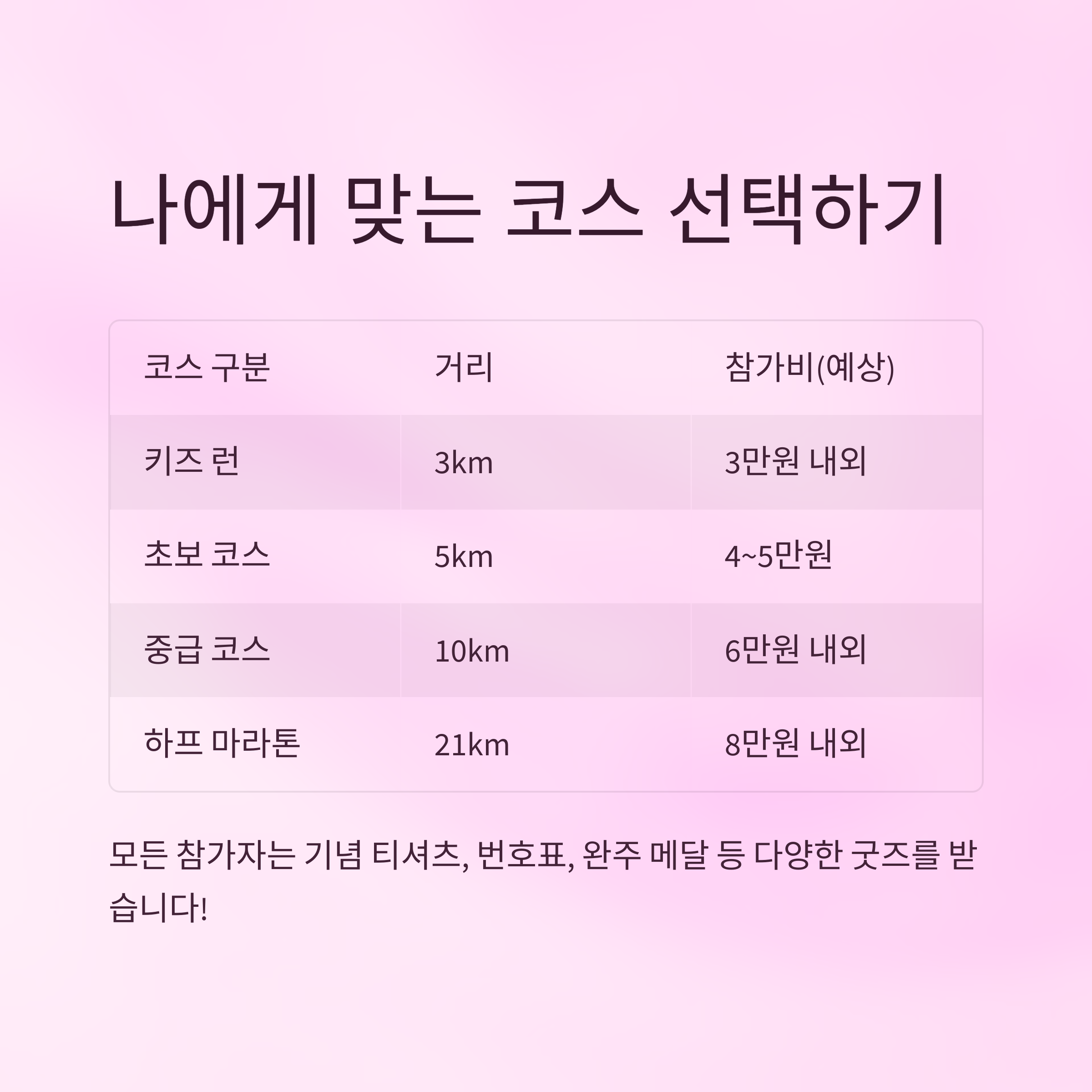 | 키즈 런 | 3km | 가족 및 어린이 | 3만원 내외 |