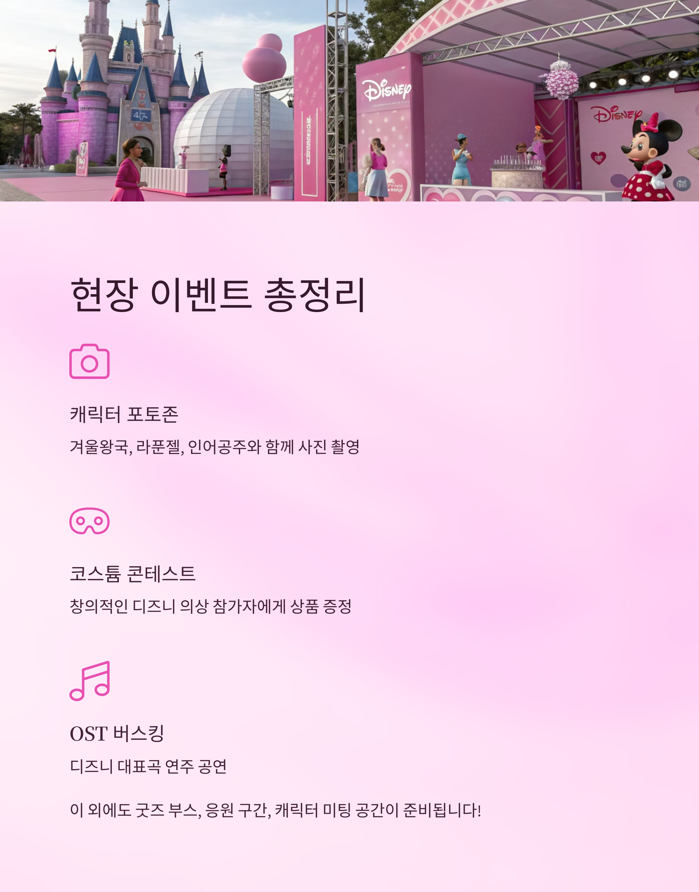 | 코스튬 콘테스트 | 창의적인 디즈니 의상 참가자에게 상품 증정 |