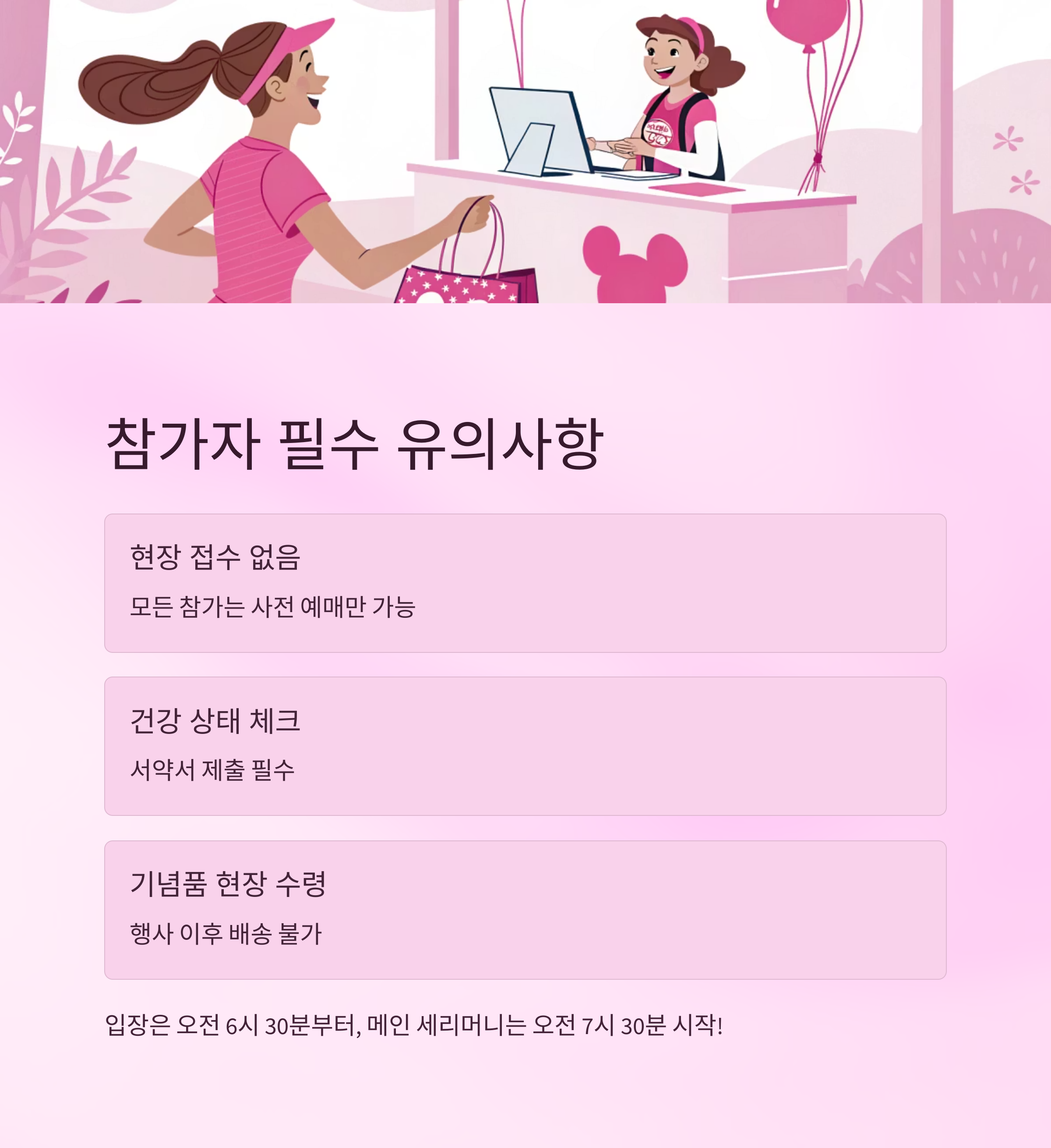 | 완주자 굿즈 | 미키, 미니, 스티치 테마의 한정판 메달 지급 |
