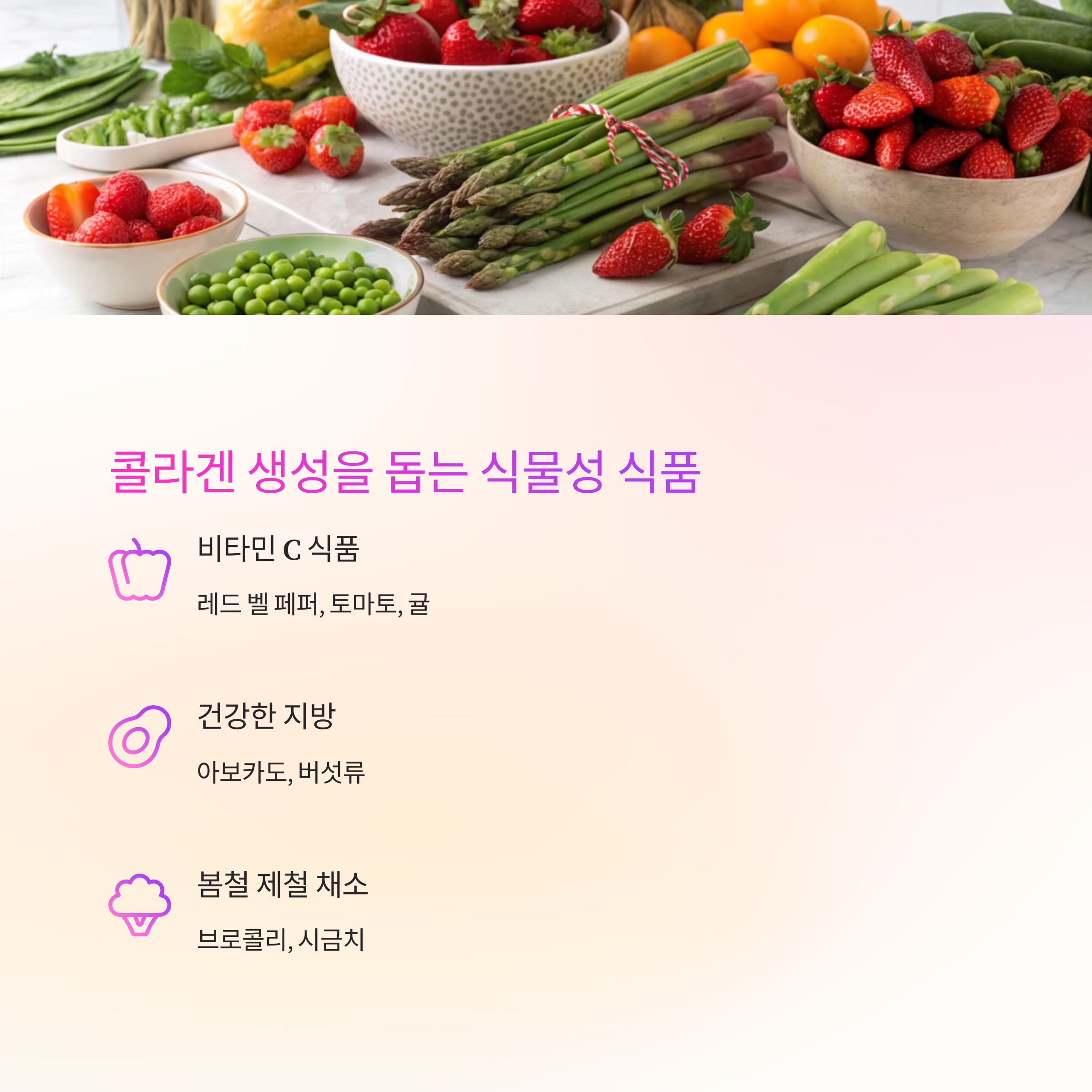 콜라겐은 우리 몸의 피부, 연골, 뼈 등을 구성하는 중요한 단백질입니다. 특히 나이가 들수록 자연스럽게 감소하게 되어 이를 보충해주는 것이 건강 관리의 핵심 중 하나로 여겨지고 있습니다. 봄철에는 계절 채소가 풍부하게 나오기 때문에 자연스럽게 식단에 다양한 식재료를 활용하기 좋습니다. 콜라겐이 풍부한 음식을 통해 몸속 깊은 곳부터 탄탄한 건강을 준비해보세요. 식단을 통해 피부 건강은 물론, 에너지까지 되찾을 수 있습니다.