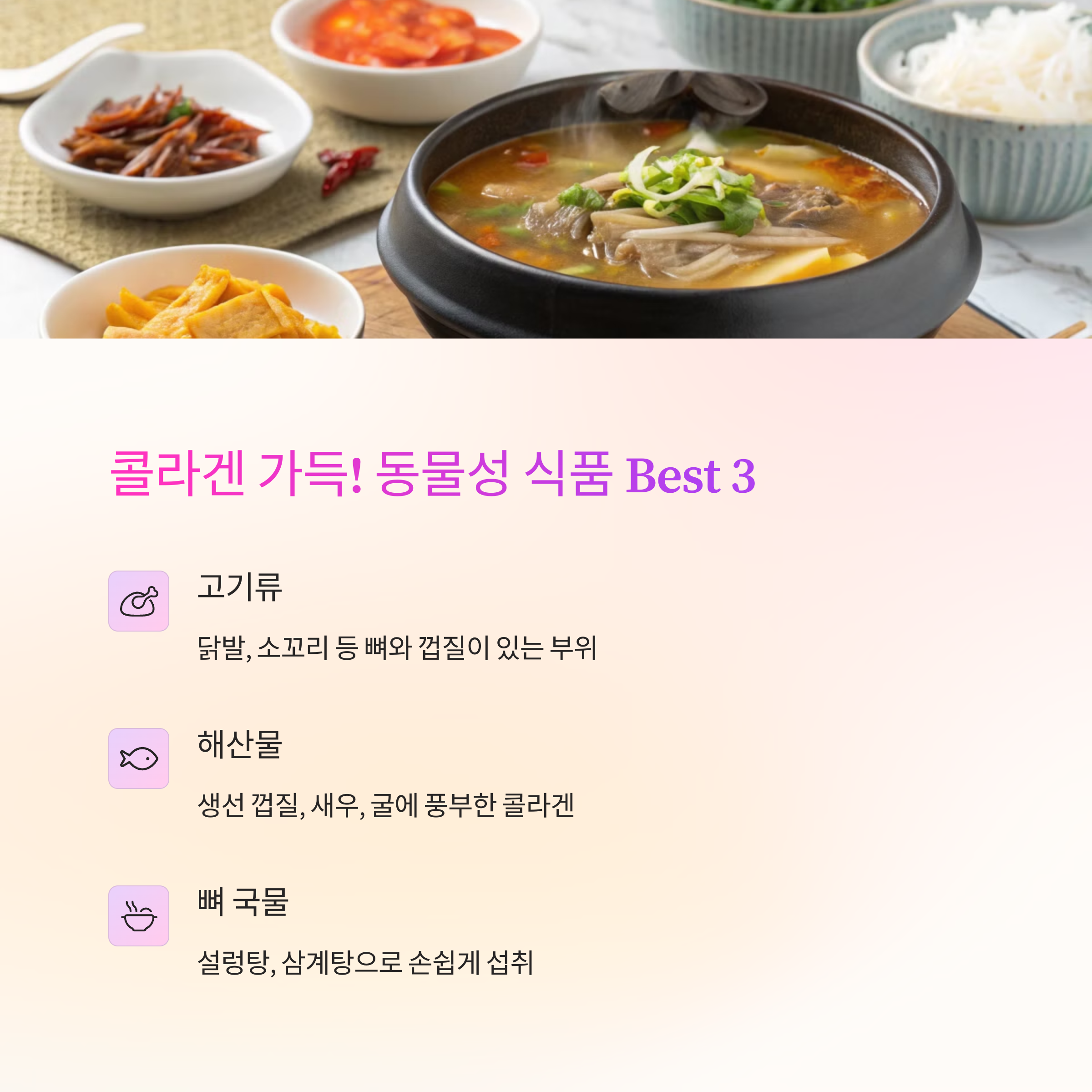 | 콜라겐이 풍부한 음식 | 뼈 국물, 껍질 포함 요리, 해산물 등 |