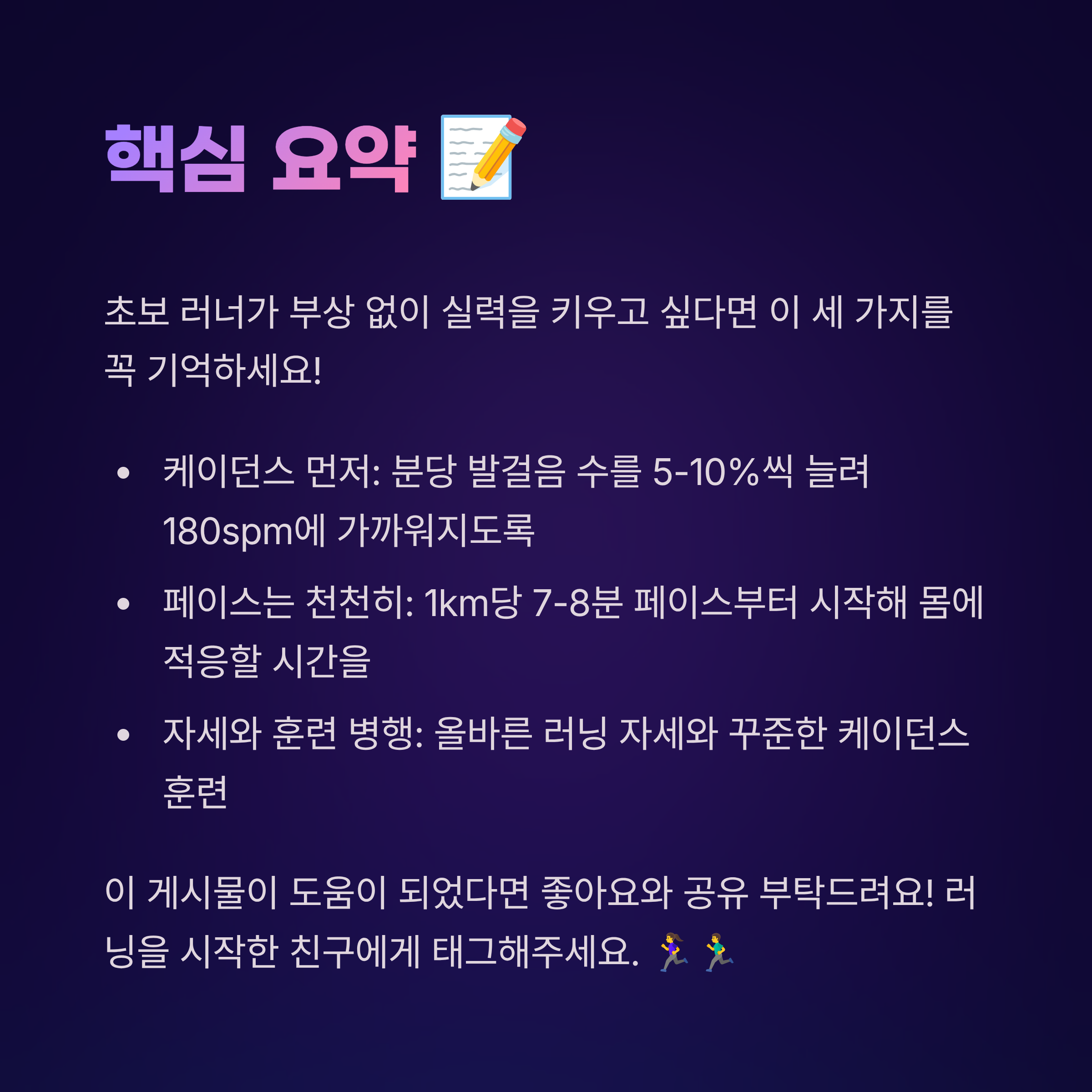 지금까지 말씀드린 내용을 한눈에 요약해 드릴게요. 초보 러너가 부상 없이 실력을 키우고 싶다면 이 세 가지를 꼭 기억해주세요!