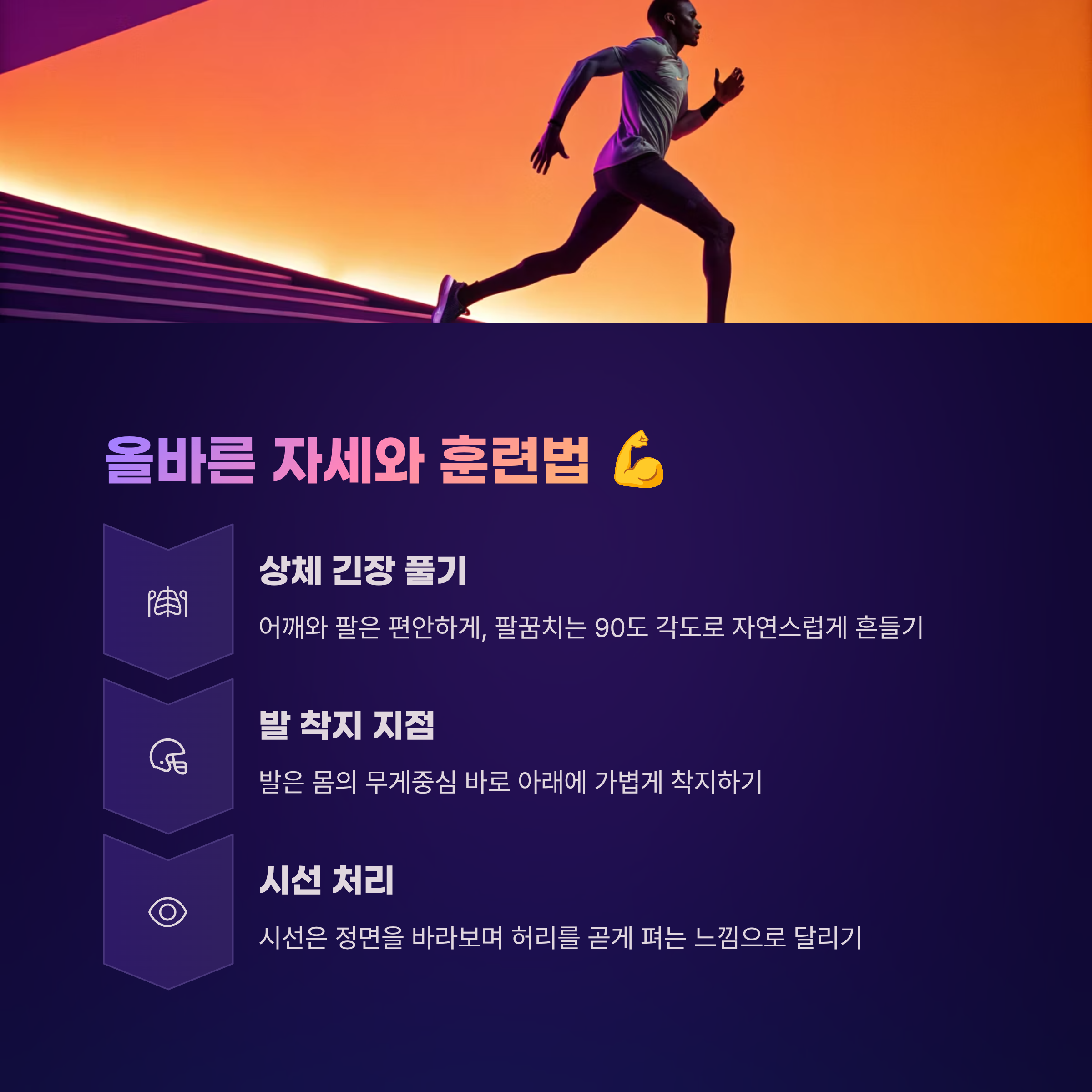 - 발 착지 지점: 발은 몸의 무게중심 바로 아래에 가볍게 착지해야 해요. 발이 몸 앞으로 너무 멀리 나가는 '오버스트라이드'는 부상의 원인이 됩니다.