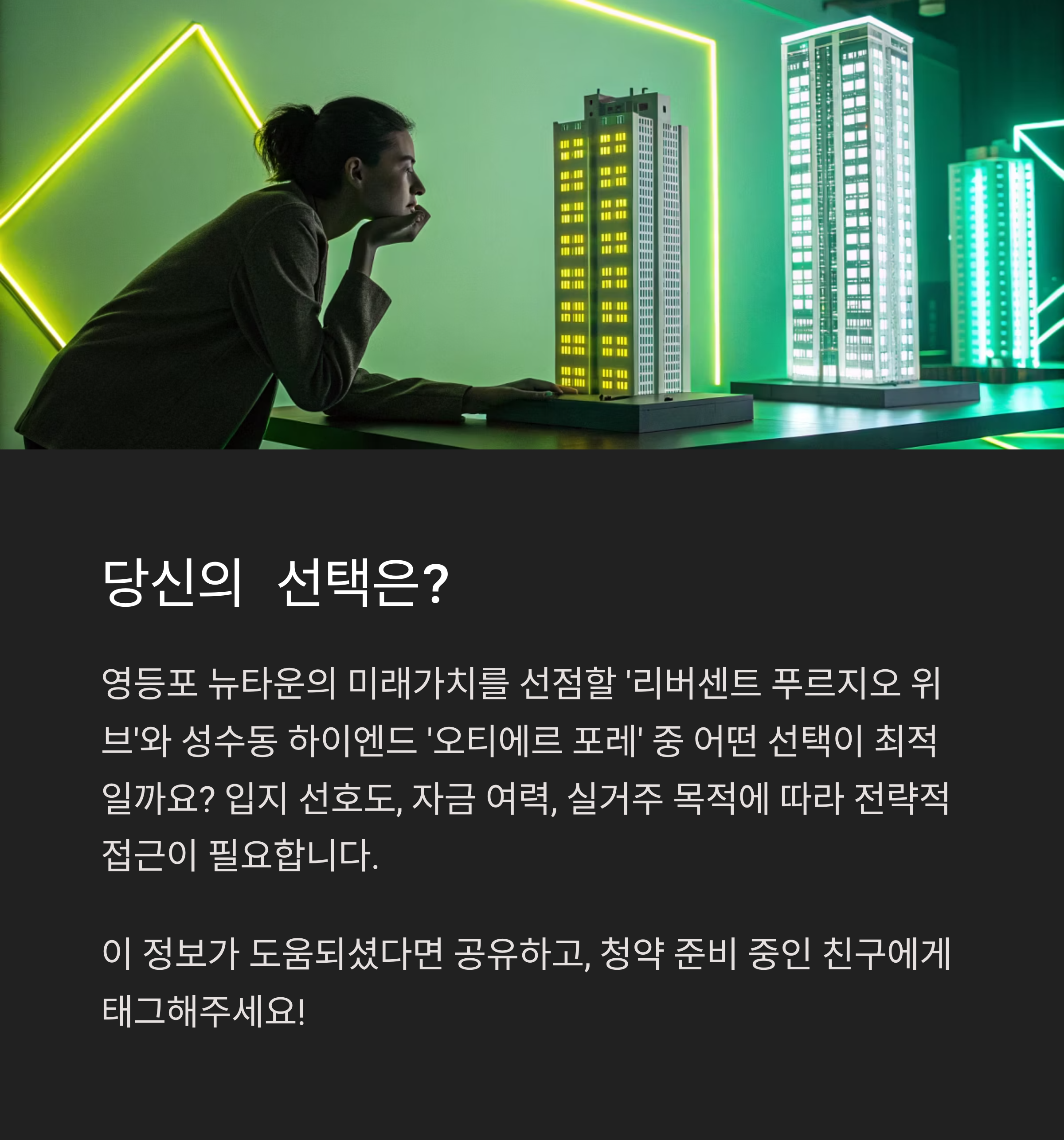 최근 청약 시장에서 가장 주목받는 단지는 단연 '리버센트 푸르지오 위브'와 '오티에르 포레'입니다. 각각 영등포와 성수동이라는 서울의 핵심 입지를 기반으로 하면서, 비규제지역 프리미엄과 파격적인 청약 스펙으로 청약 수요자들의 시선을 사로잡고 있습니다. 본 글에서는 두 단지의 분양가, 청약 경쟁률, 일정, 청약 전략까지 비교 분석하며 실수요자와 투자자 모두에게 최적의 판단 기준을 제시해드립니다.