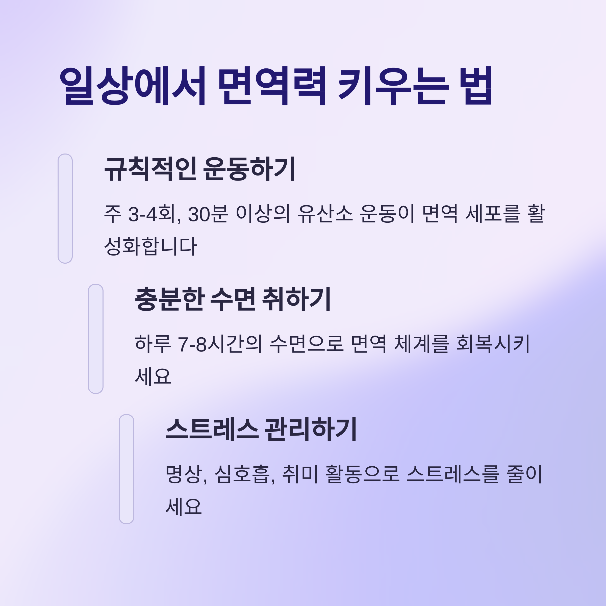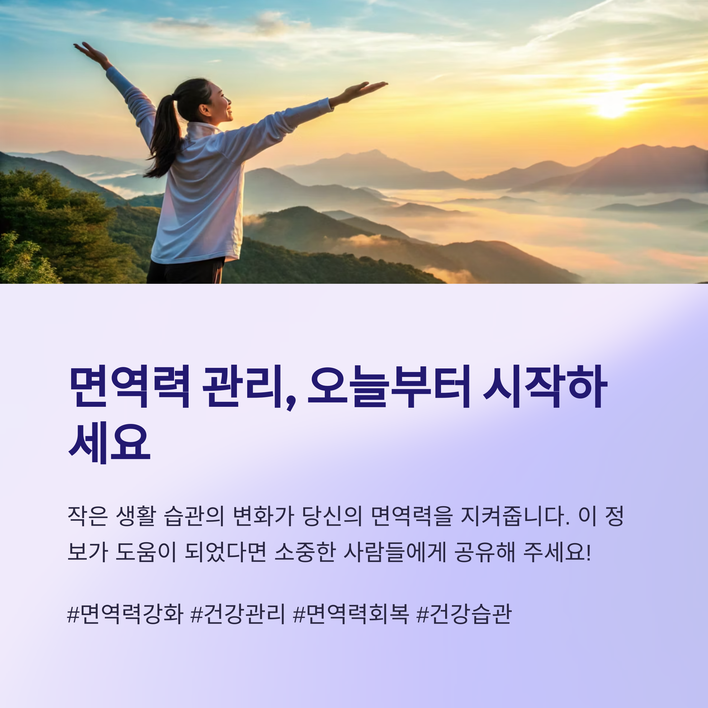 면역력은 단순한 질병 예방을 넘어 삶의 질 향상과도 직결됩니다. 작은 실천이 큰 변화를 만들어낼 수 있어요. 여러분의 면역력 관리는 어떠신가요? 이 글에서 소개한 증상 중 경험해 보신 것이 있나요? 여러분만의 면역력 관리 팁이 있다면 댓글로 공유해 주세요!