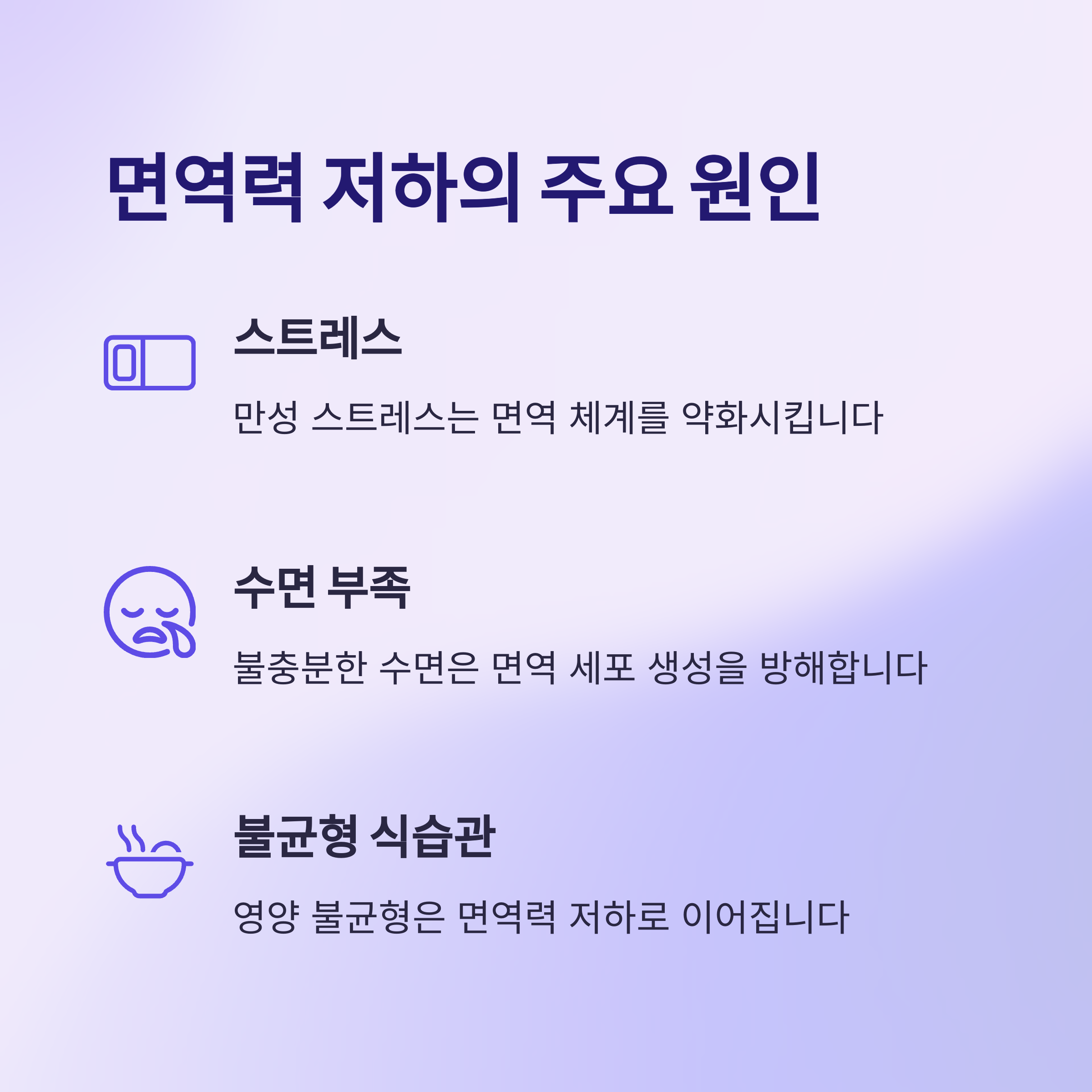 면역력 저하는 다양한 요인에 의해 발생할 수 있습니다. 주요 원인을 알아보고 생활 습관을 개선해 보세요.