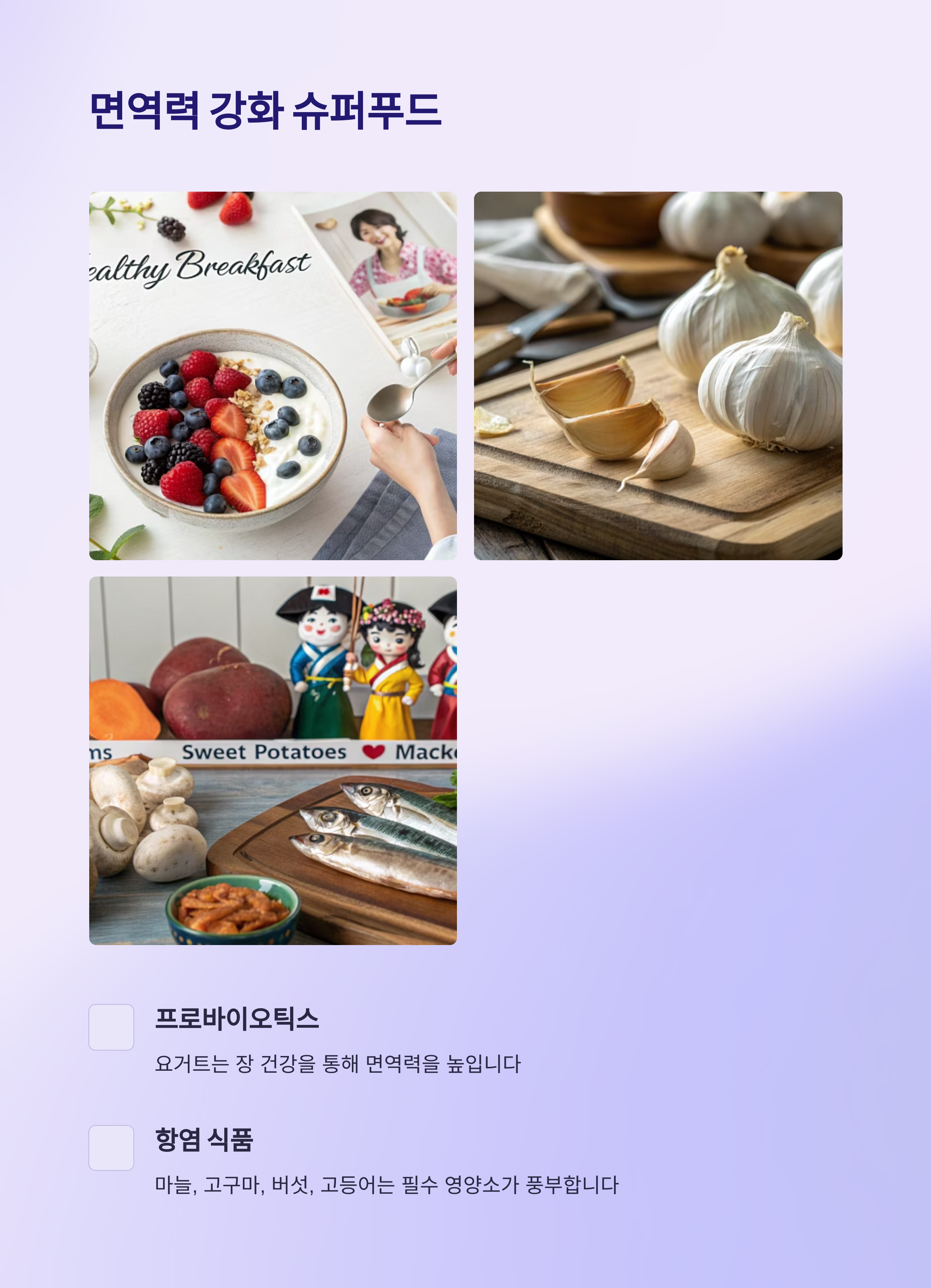 - 비타민 D, 아연, 프로바이오틱스, 베타글루칸 등 필요시 섭취