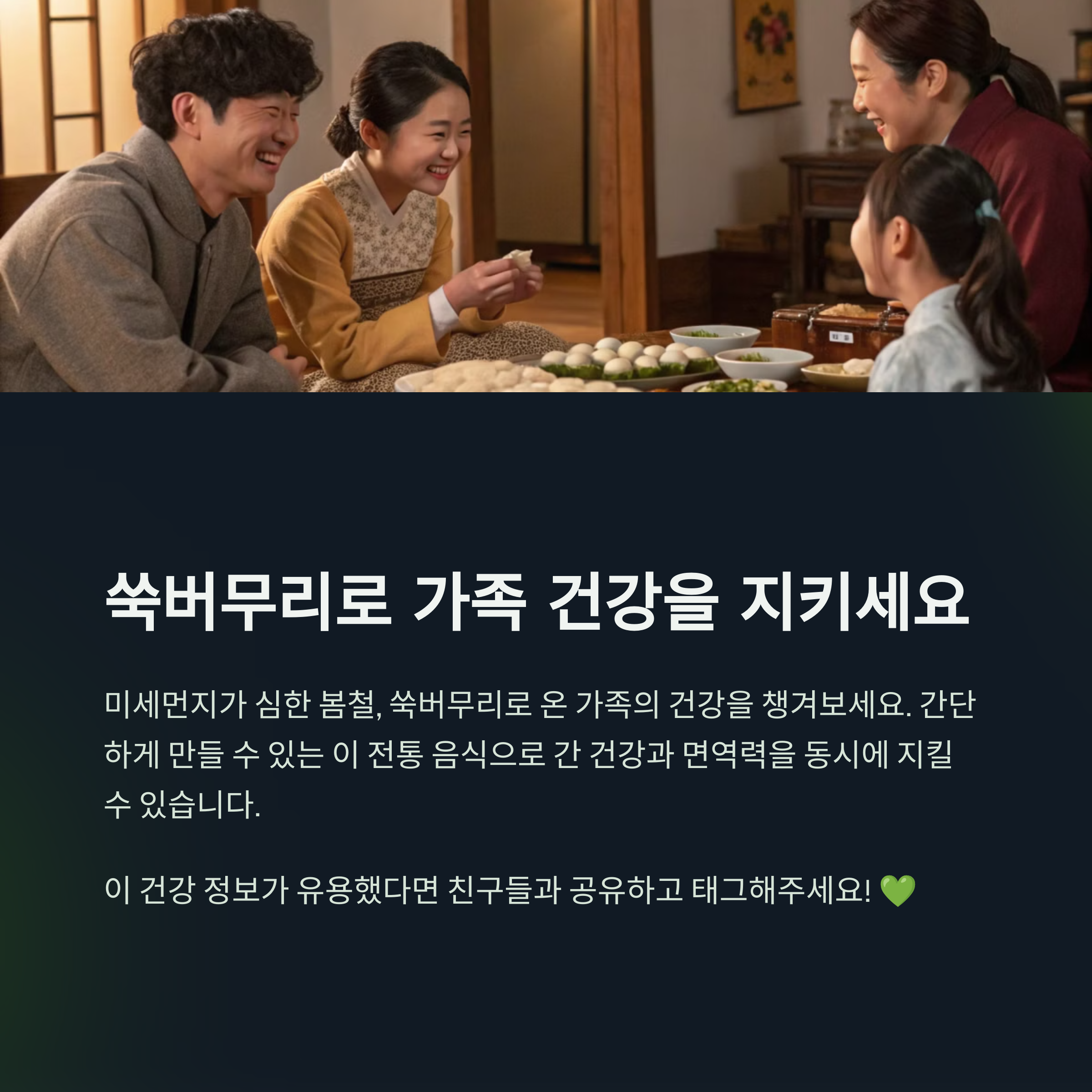 오늘 소개해드린 쑥버무리는 미세먼지로부터 몸을 보호하고, 간과 위장을 동시에 건강하게 지킬 수 있는 훌륭한 전통 음식입니다. 간단한 재료와 조리법으로 집에서도 손쉽게 만들어 드실 수 있어, 일상 속에서 건강을 챙기기에 최적의 선택이 될 수 있습니다. 봄철 제철 재료인 쑥을 활용한 건강 식단으로, 가족 모두의 면역력을 함께 챙겨보는 건 어떨까요? 매일의 작은 선택이 큰 건강을 만들어갑니다. 자연이 준 선물인 쑥, 올봄엔 쑥버무리로 건강한 일상을 시작해보세요.