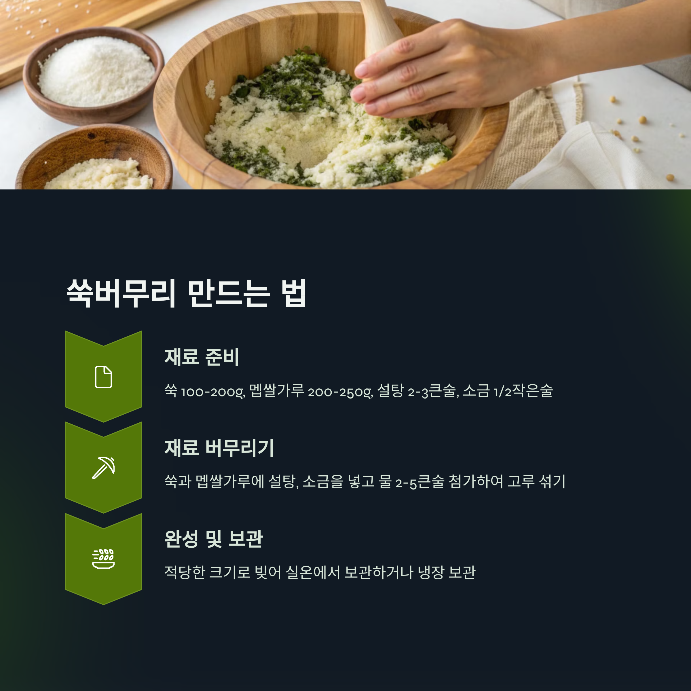 쑥버무리를 만드는 방법은 매우 간단합니다. 손질한 쑥 100~200g과 멥쌀가루 200~250g을 준비하고, 설탕 2~3큰술과 소금 1/2작은술을 넣어 골고루 버무려줍니다. 물은 약간씩 넣어가며 농도를 조절해주면 되며, 기호에 따라 콩가루나 견과류, 팥 등을 추가해도 좋습니다. 쪄낸 후에는 한김 식혀 바로 먹을 수 있어 간편한 건강 간식으로 제격입니다. 제철 식재료를 활용한 건강한 습관이 몸을 살리고, 가족의 면역력 향상에도 도움이 됩니다.