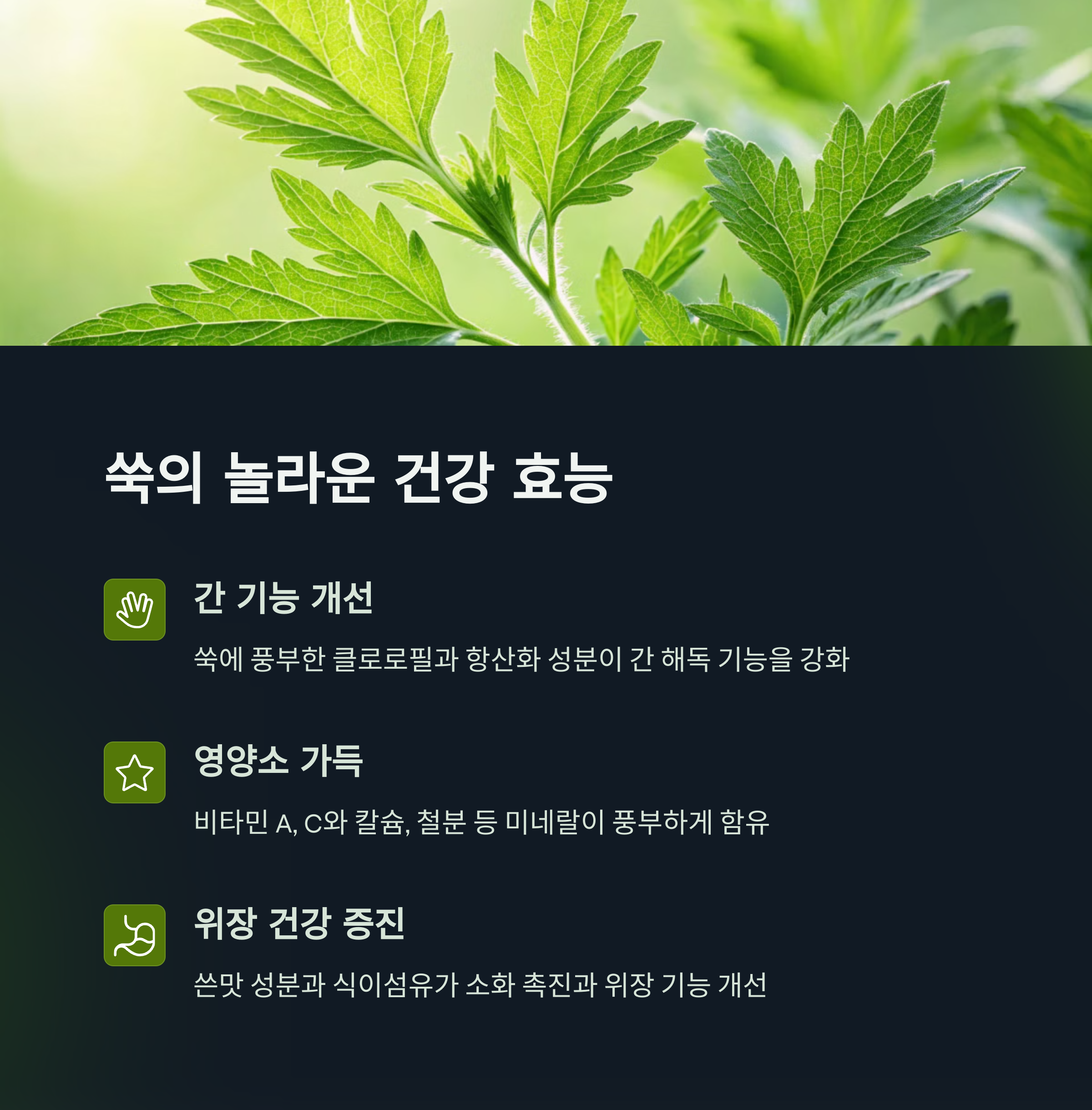 | 쑥은 체내 유해물질 배출을 도와 해독 효과를 줍니다. | 위장, 간, 면역력 등 다양한 건강 효과가 있습니다. | 쑥버무리는 봄철 대표 건강식으로 널리 사랑받고 있습니다. |