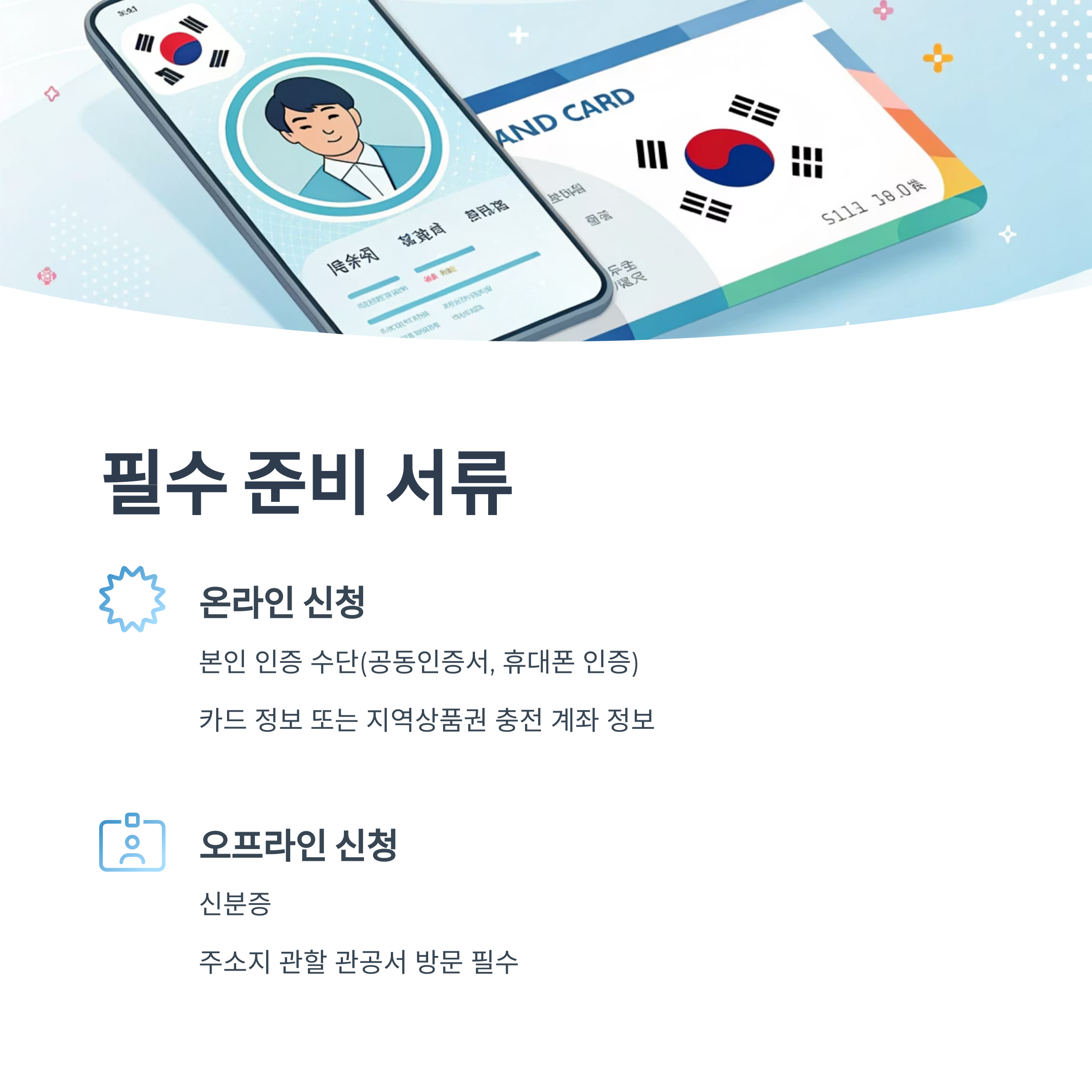 오프라인 신청은 신분증과 주소지 관할 관공서 방문이 필수입니다.