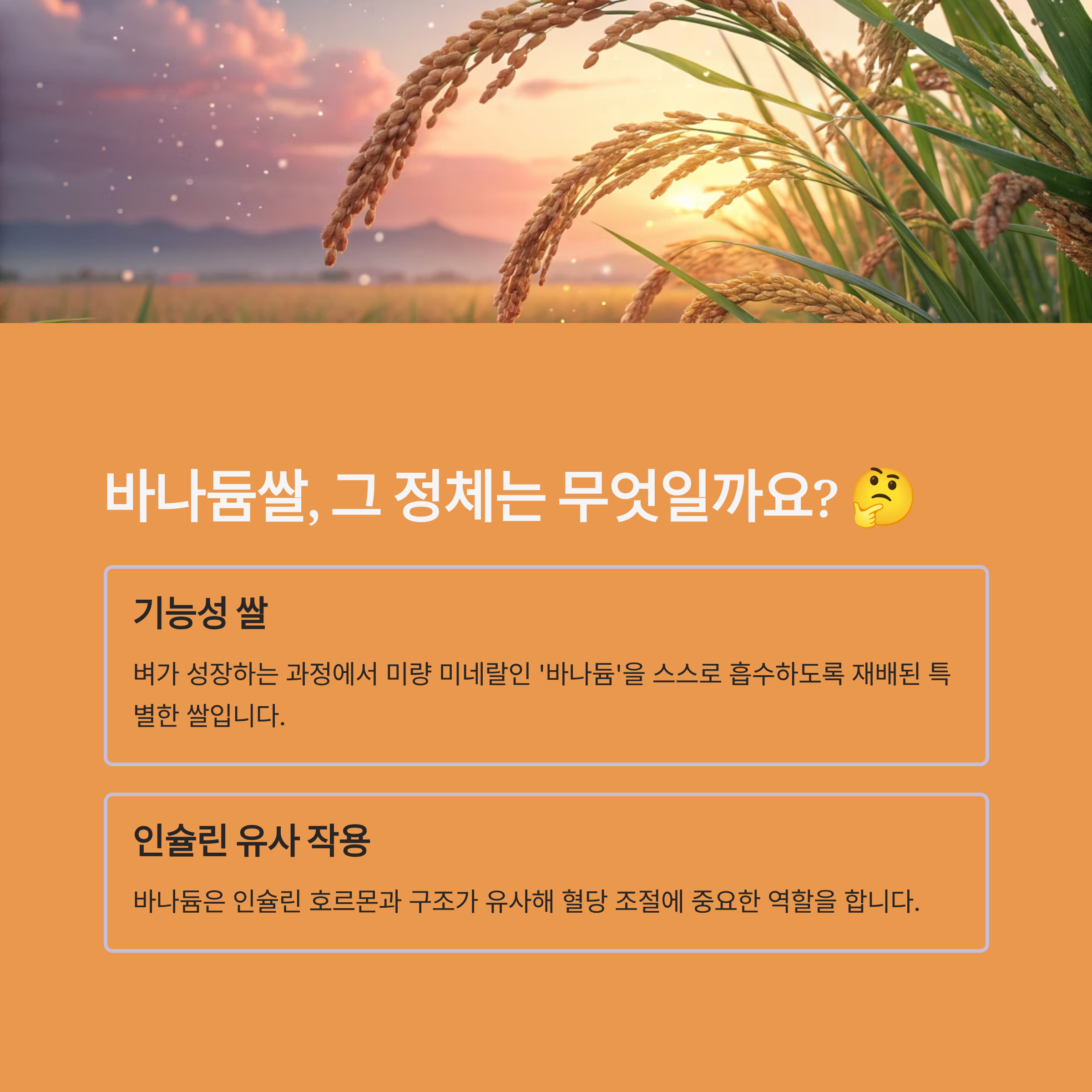 - 바나듐쌀의 원리: 인슐린과 유사한 작용을 하는 바나듐 미네랄을 함유해 혈당 조절을 돕습니다.