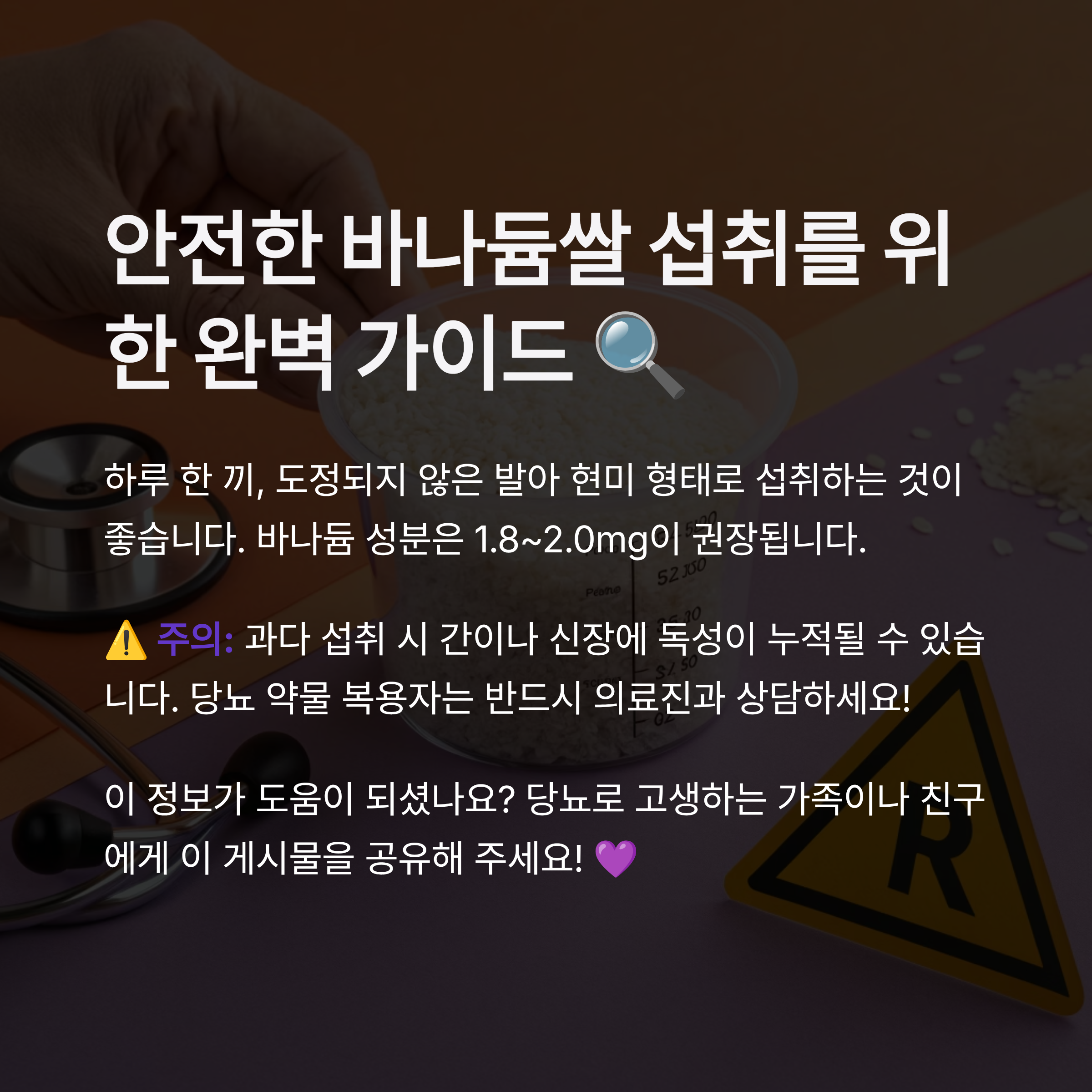 바나듐쌀은 당뇨로 고생하는 많은 분들께 새로운 희망이 될 수 있는 똑똑한 선택지입니다. 하지만 반드시 올바른 지식과 전문가의 조언을 바탕으로 현명하게 섭취하셨으면 좋겠어요. 이 글이 여러분의 건강한 삶에 조금이나마 도움이 되었기를 바랍니다! 😊