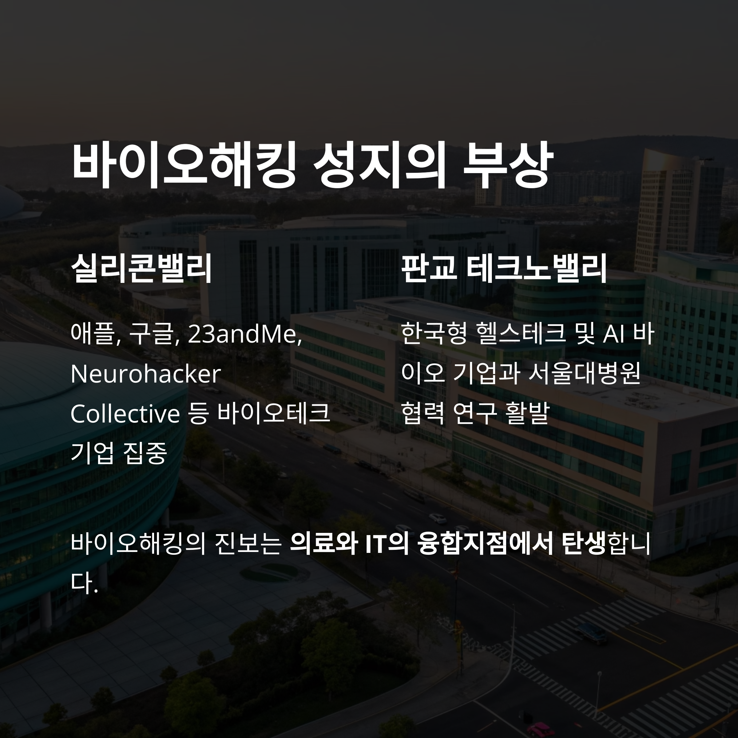 수많은 바이오테크 기업이 위치 - 판교 테크노밸리: 한국형 헬스테크 및 AI 바이오 기업이 몰려 있으며