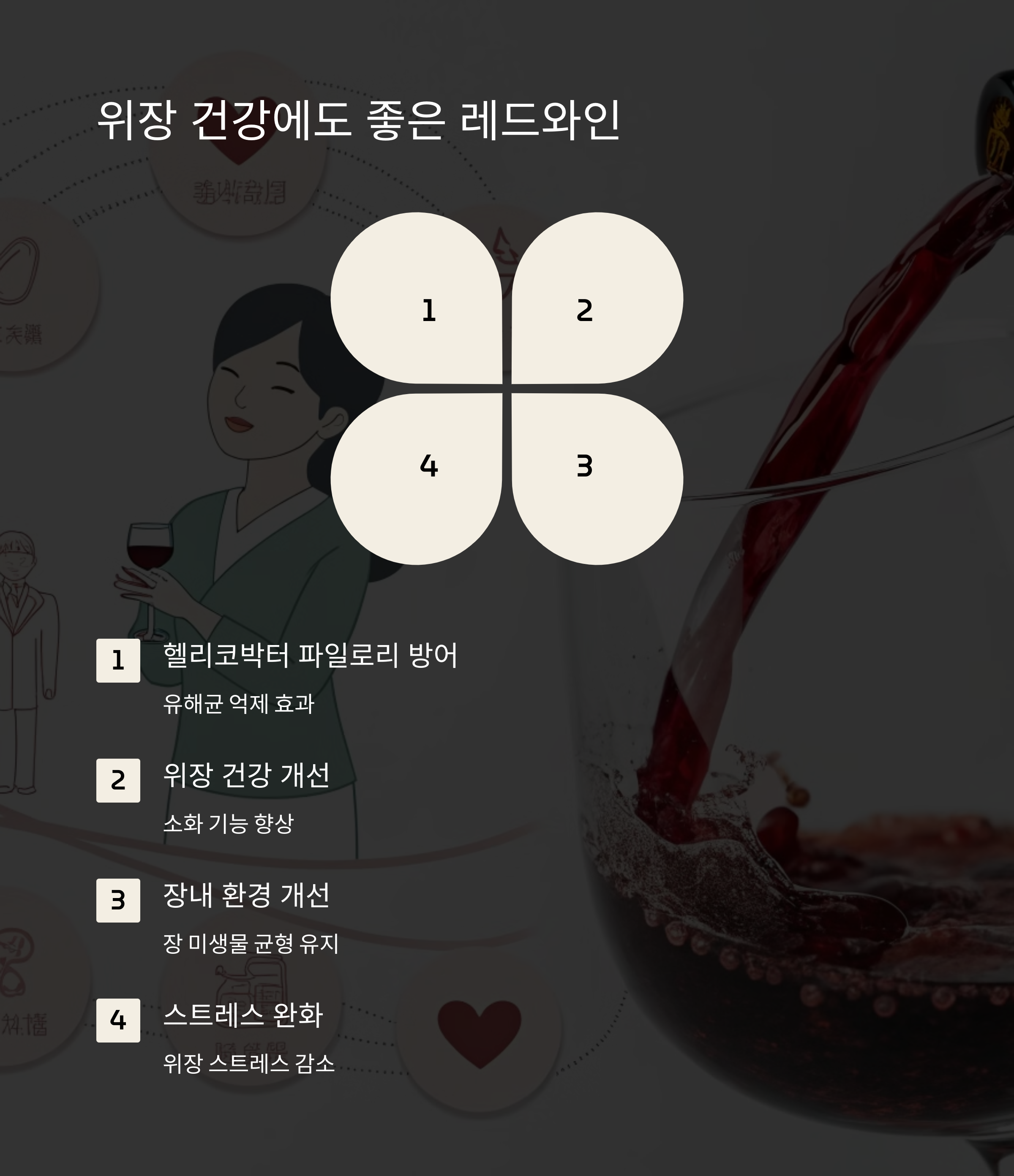 | 헬리코박터 파일로리 | 레드와인은 헬리코박터 파일로리(H. pylori)와 같은 유해균에 대한 방어 효과도 가지고 있습니다. |