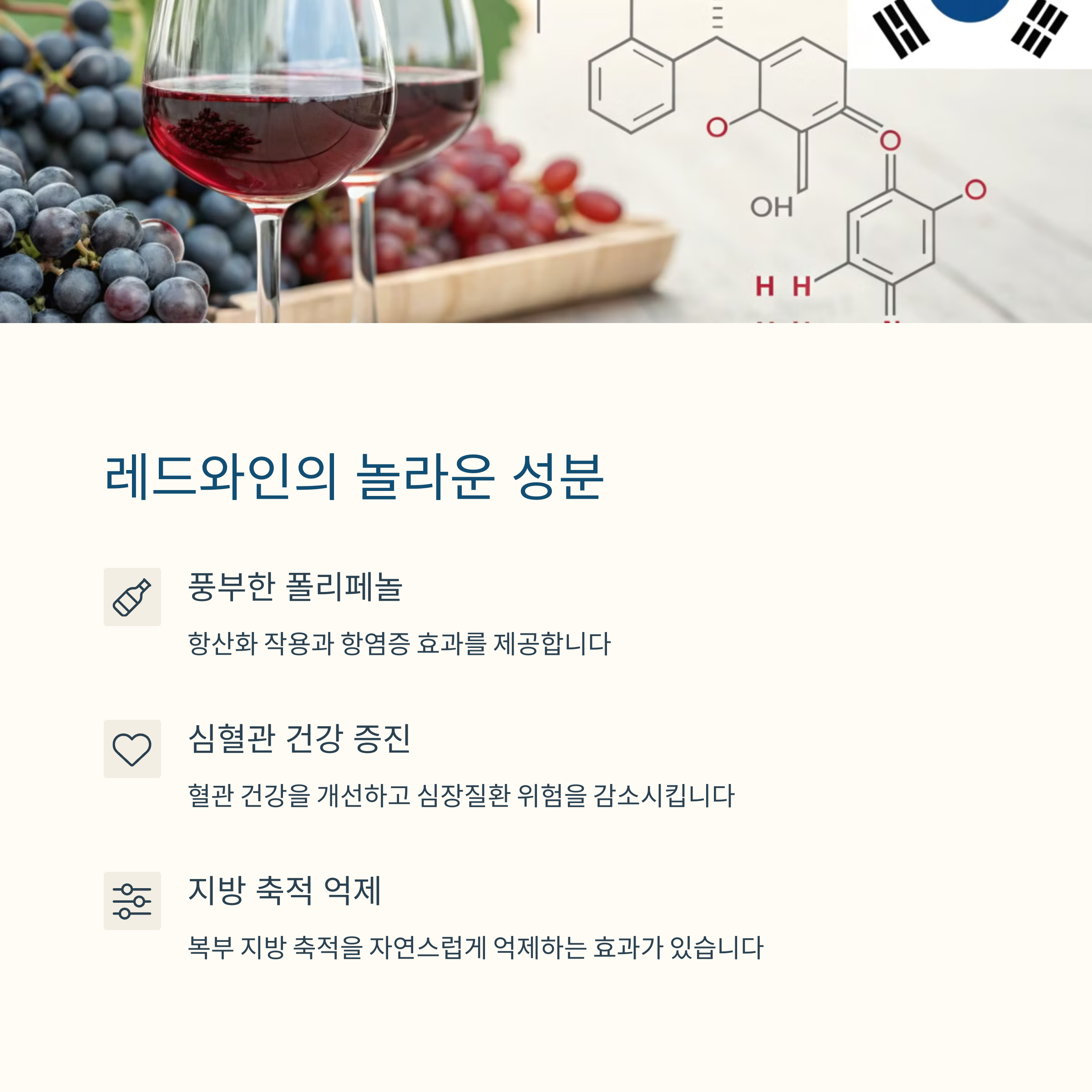 | 레드와인의 주요 성분으로 복부 지방을 감소시킬 수 있음 | 위장 건강에 도움을 주며, 위염 예방에 효과적 | 심혈관 질환 예방 및 건강 유지 |