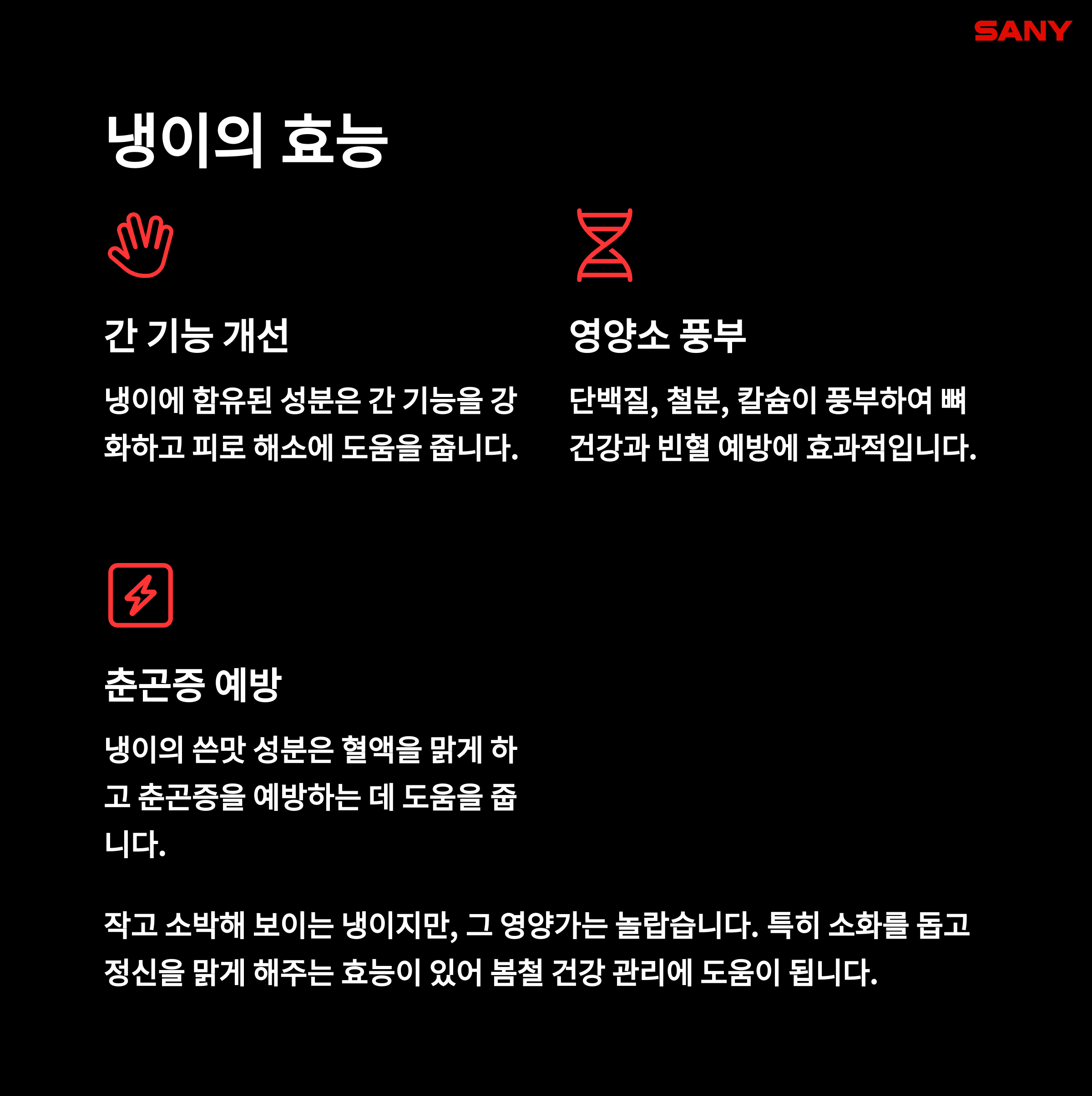간 기능 회복과 피로회복에 좋은 아미노산이 풍부하며, 쓴맛 덕분에 식욕을 돋우는 효과가 있습니다. - 맛있게 먹는 법: 데쳐서 초고추장에 무쳐먹거나, 비빔밥 고명으로 활용해보세요.