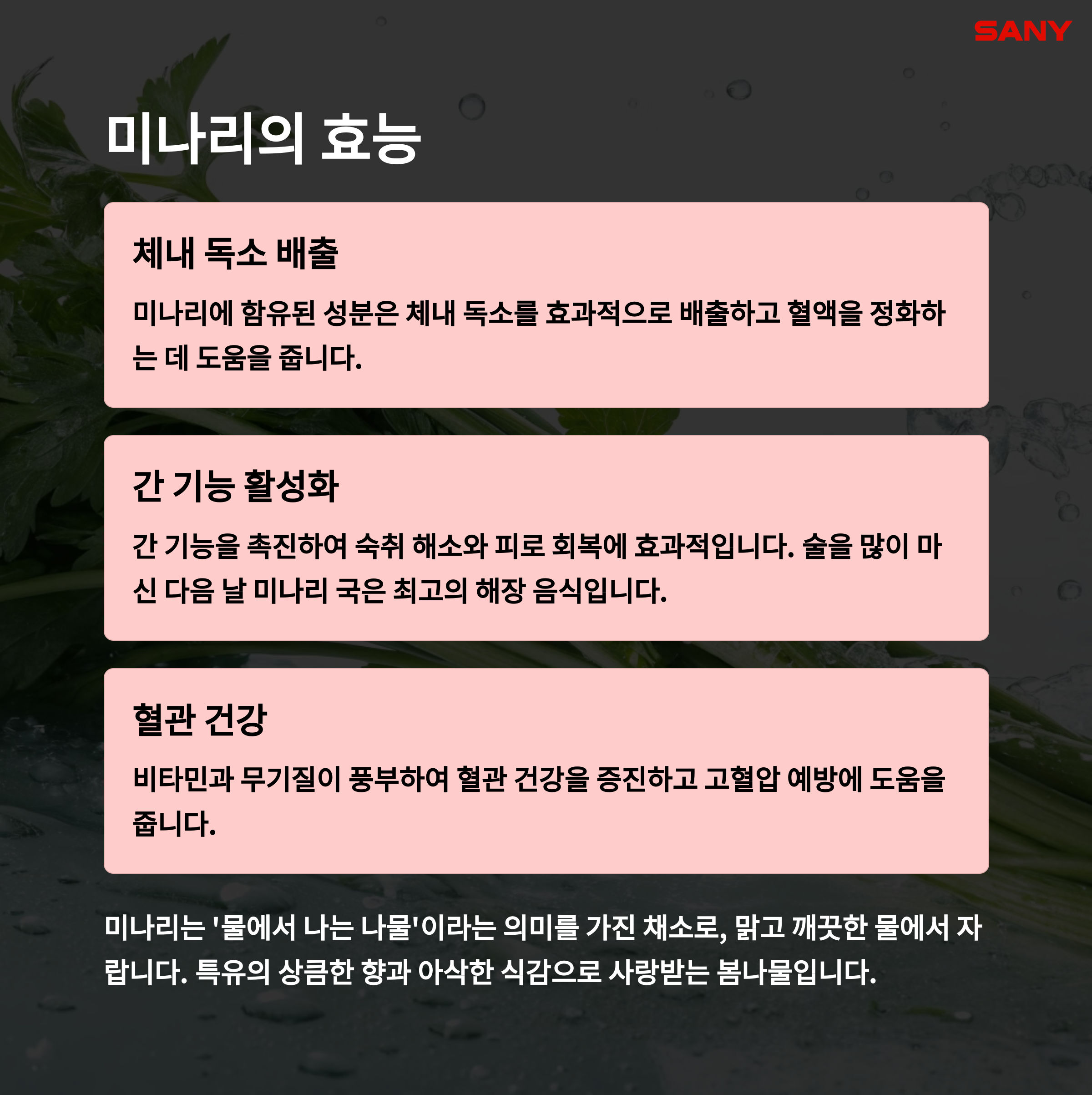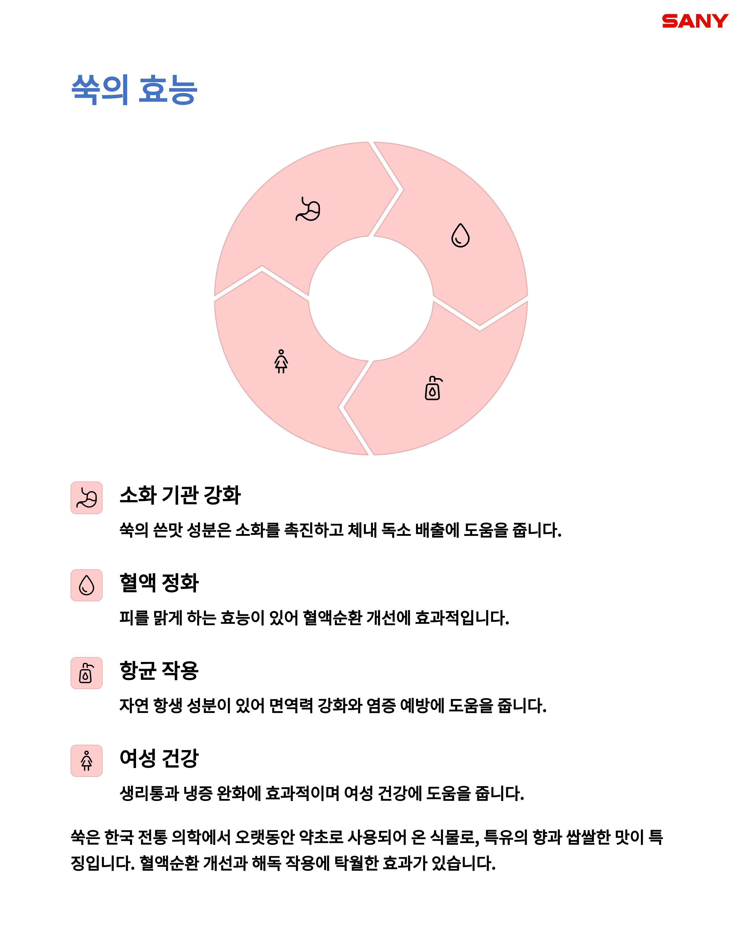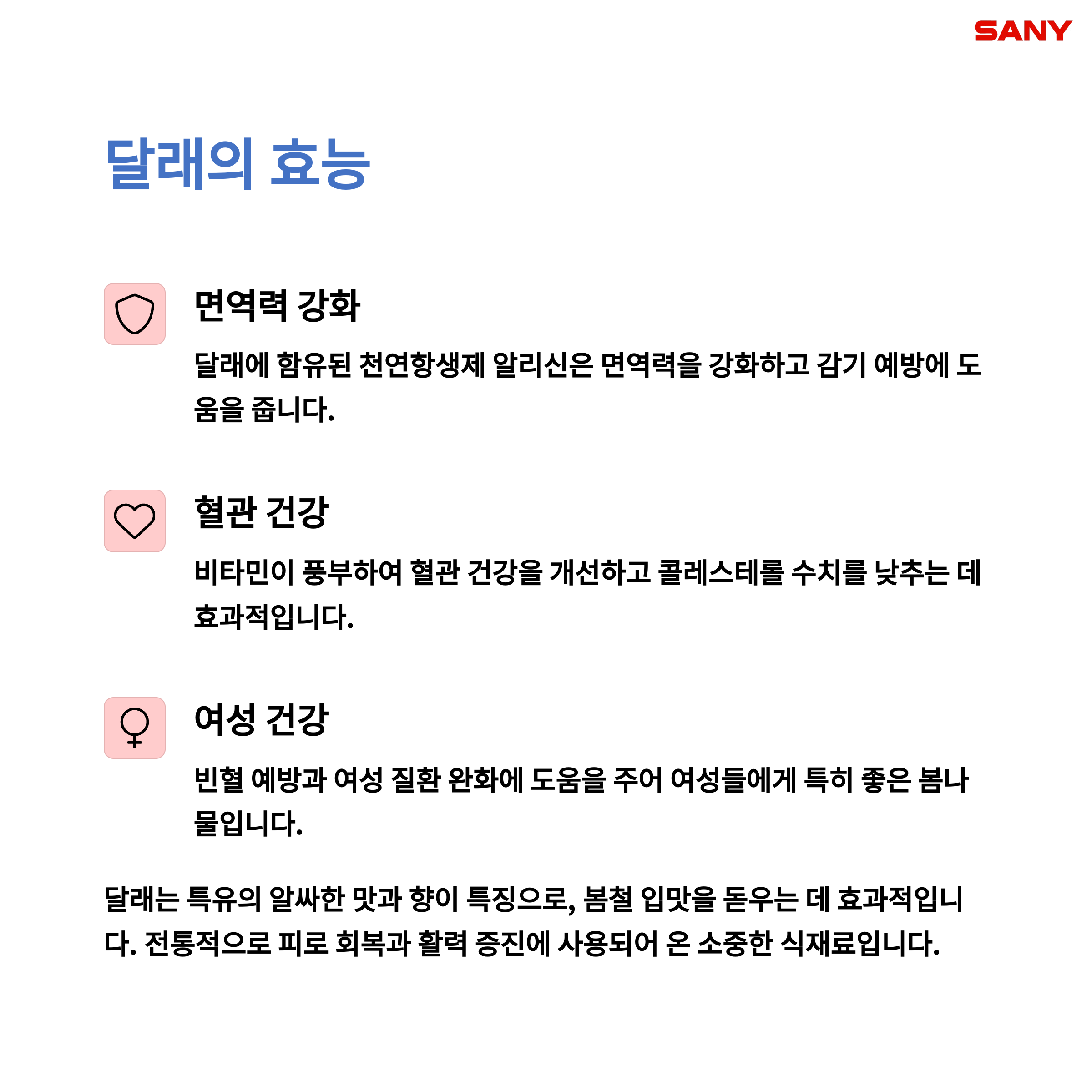 비타민과 무기질이 풍부하고, 면역력 강화에 탁월한 나물입니다. 몸을 따뜻하게 해 임산부에게도 좋습니다. - 맛있게 먹는 법: 국, 된장찌개, 쑥떡, 튀김 등 다양하게 즐겨보세요.